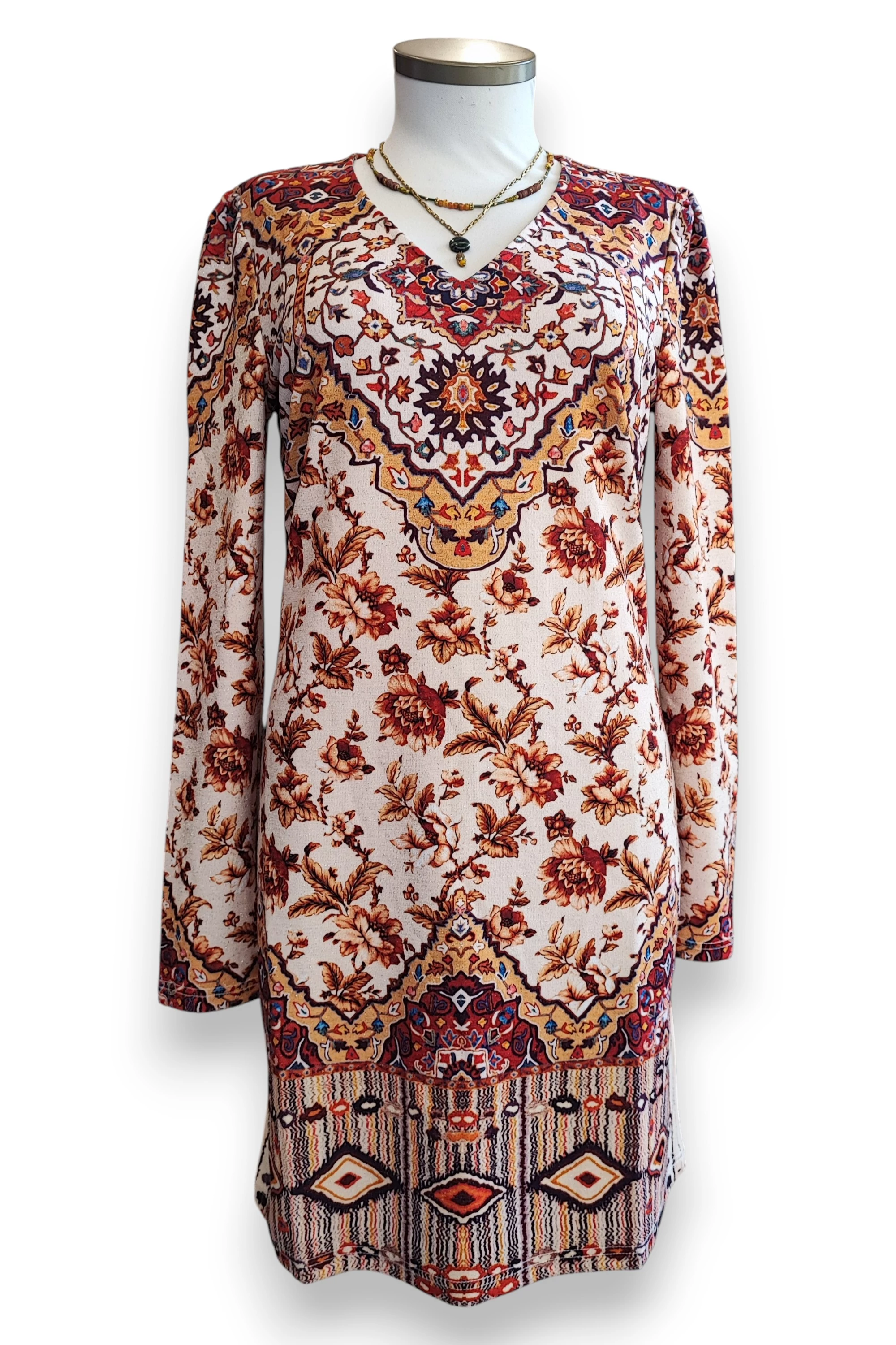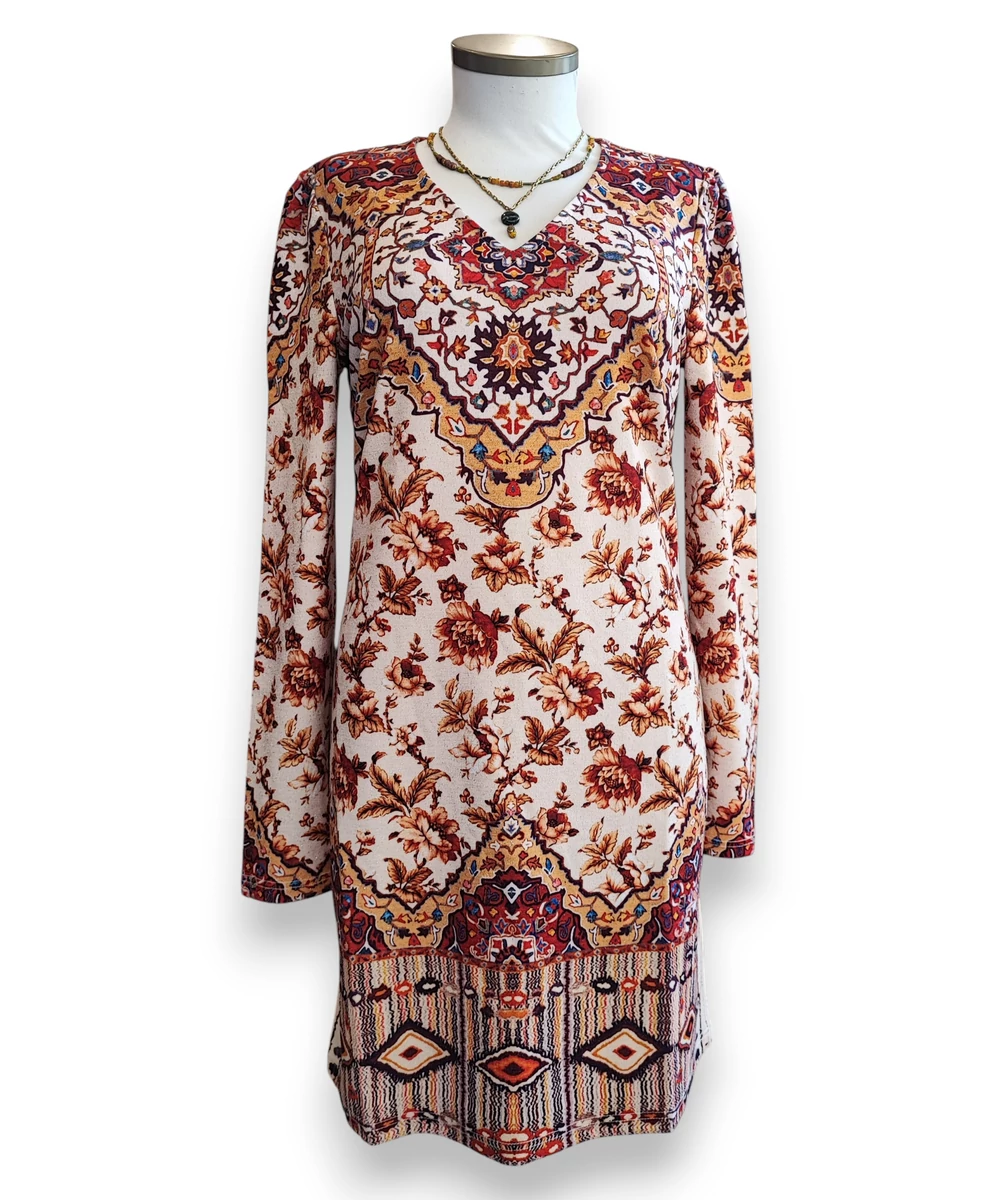 Karcsúsított fazonú, hosszú ujjú ruha / tunika különleges mintákkal. Anyag: spandex, elasztán.