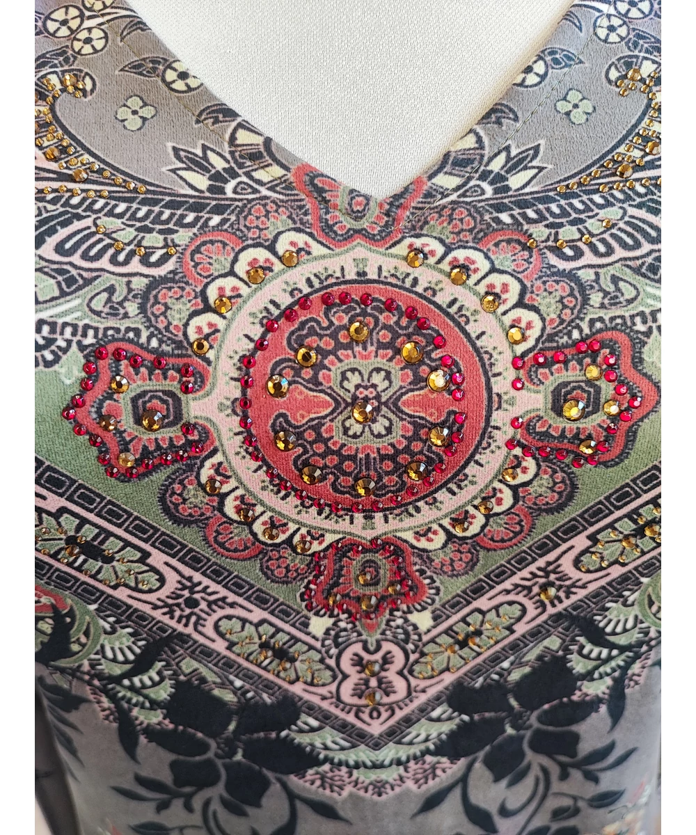Karcsúsított fazonú, hátul zipzáras, etnikai mintás ruha, nőies szabásvonal.