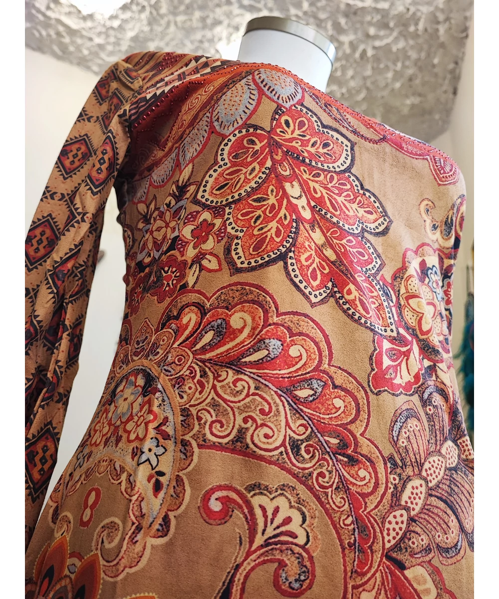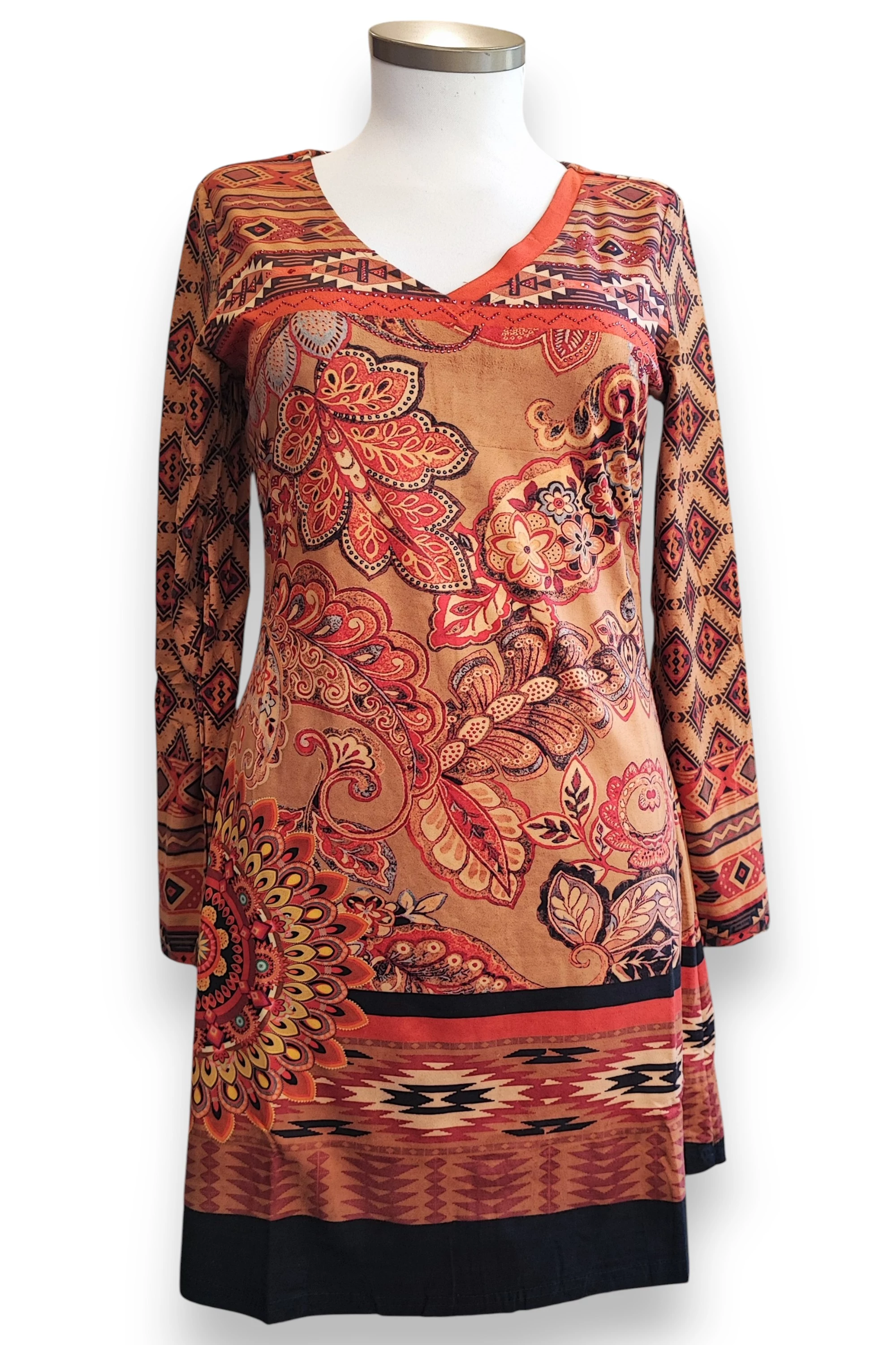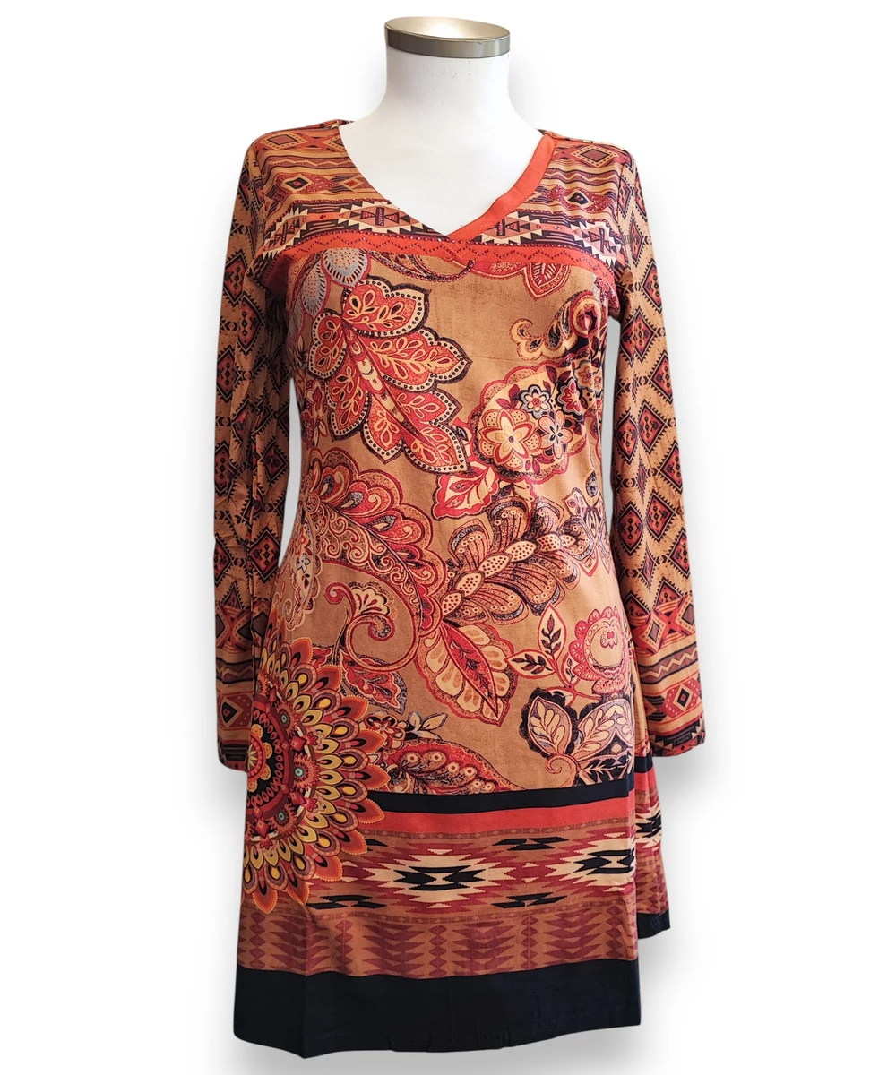 Karcsúsított fazonú, hátul zipzáras, etnikai mintás ruha, nőies szabásvonal.