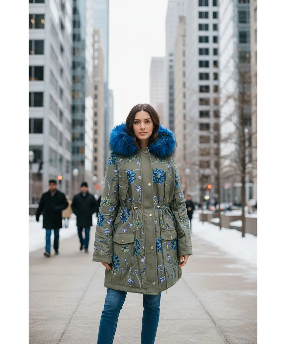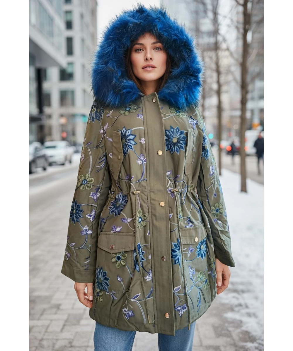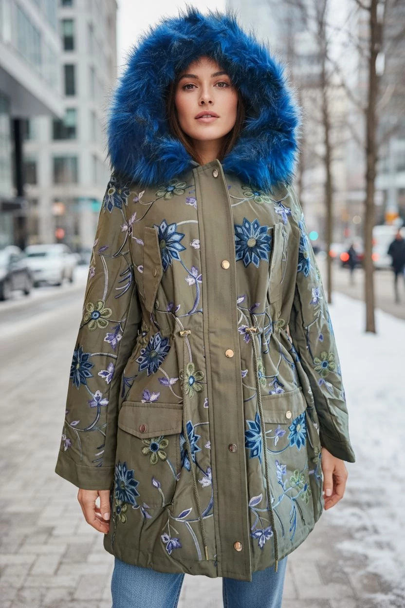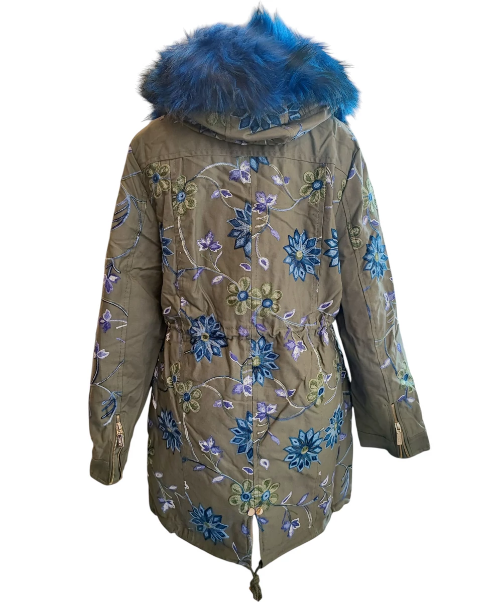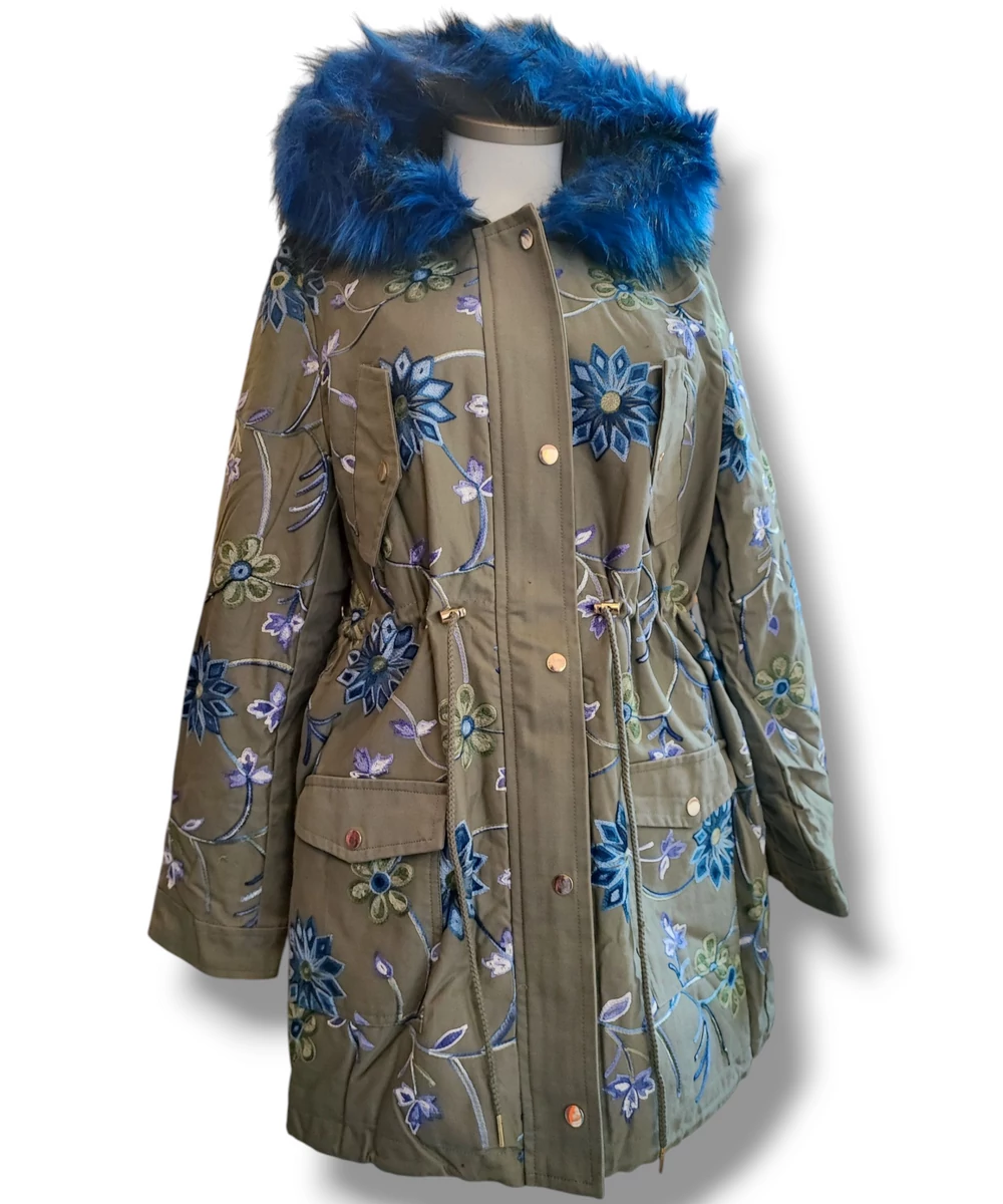 Hoszított fazonú, parka téli kabát gyönyörű hímzett virágokkal. Vastag és melegen bélelt. A kabát karcsúsítható és 4 külső zseb van rajta.