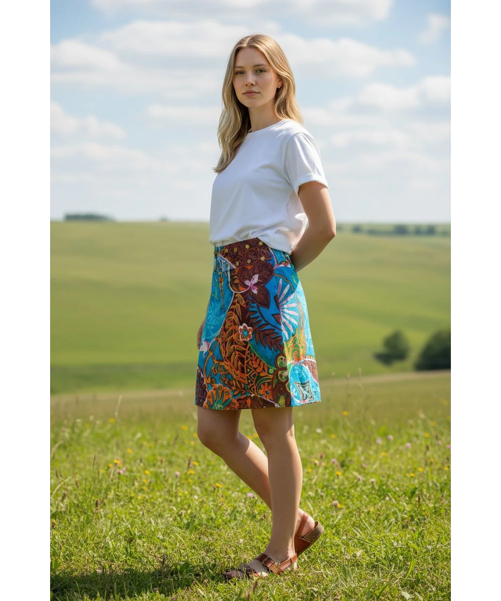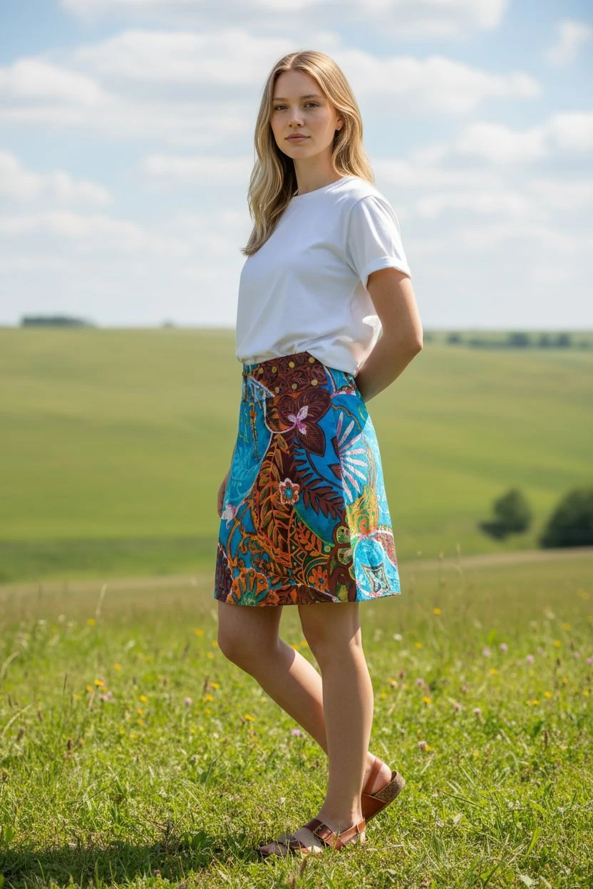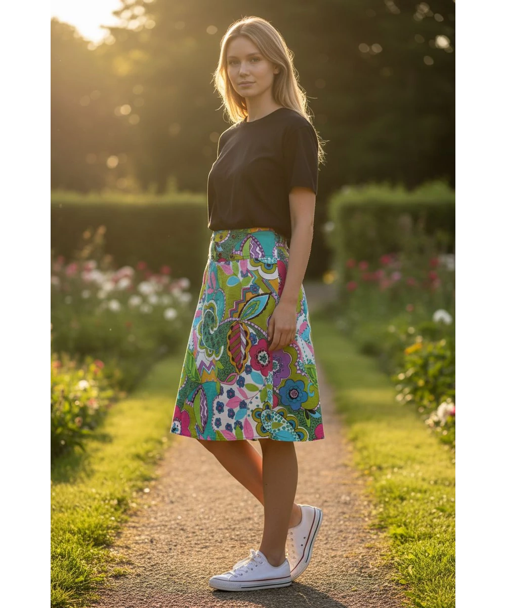 Patentos megoldással méretre igazítható, középhosszú szoknya. Egyedi mintázattal és színekkel, hangulatodhoz illően hordhatod. Anyaga 100% - ban pamut.