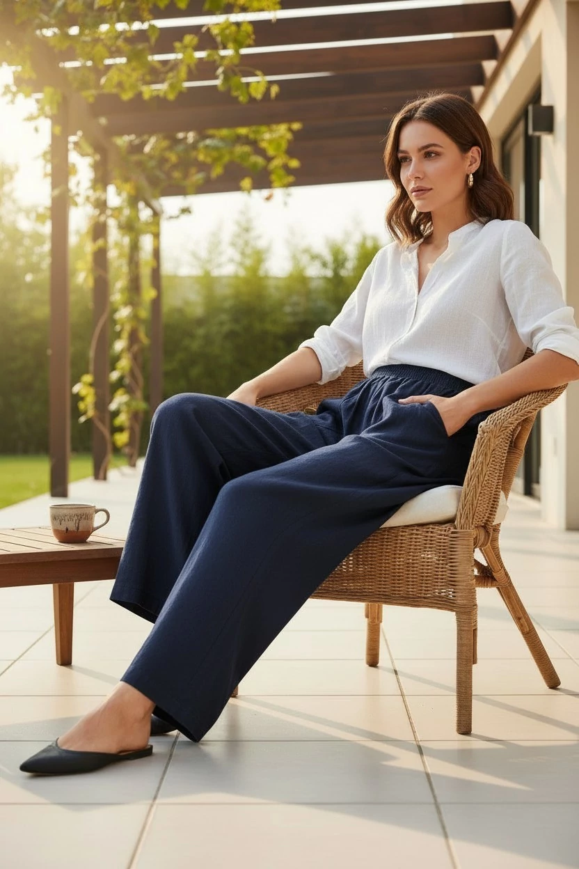 Derékban gumis, egyszerű szabású nadrág. Kényelmes és laza fazon.