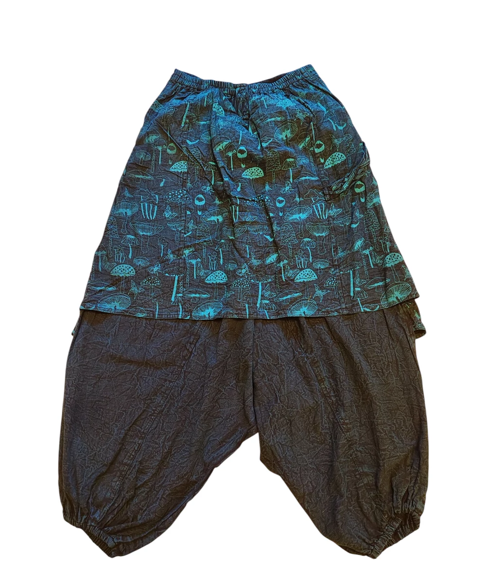 Ejtett ülepű nadrág amit a " rávarrt " szoknya rész tesz különlegessé. Anyaga vastagabb pamutvászon.