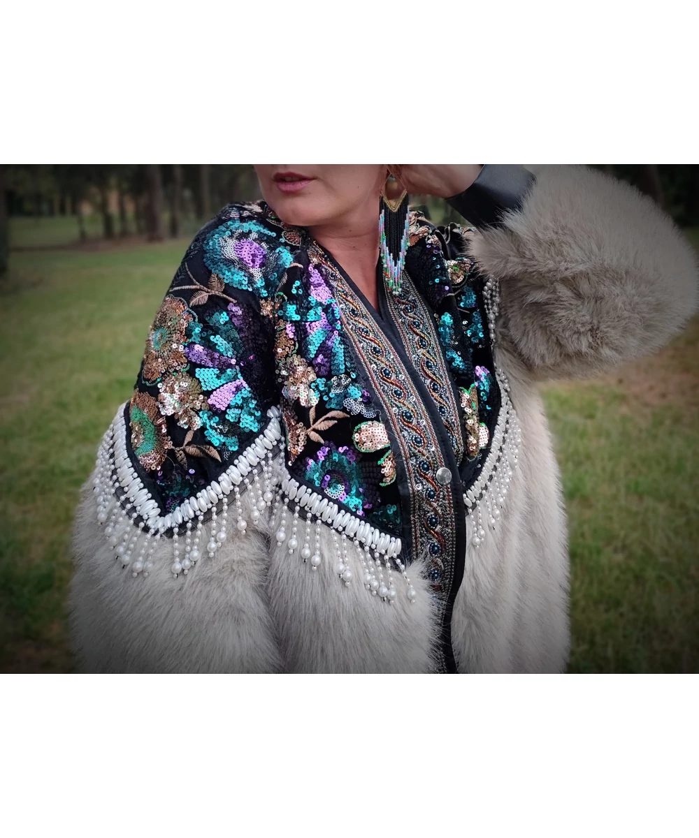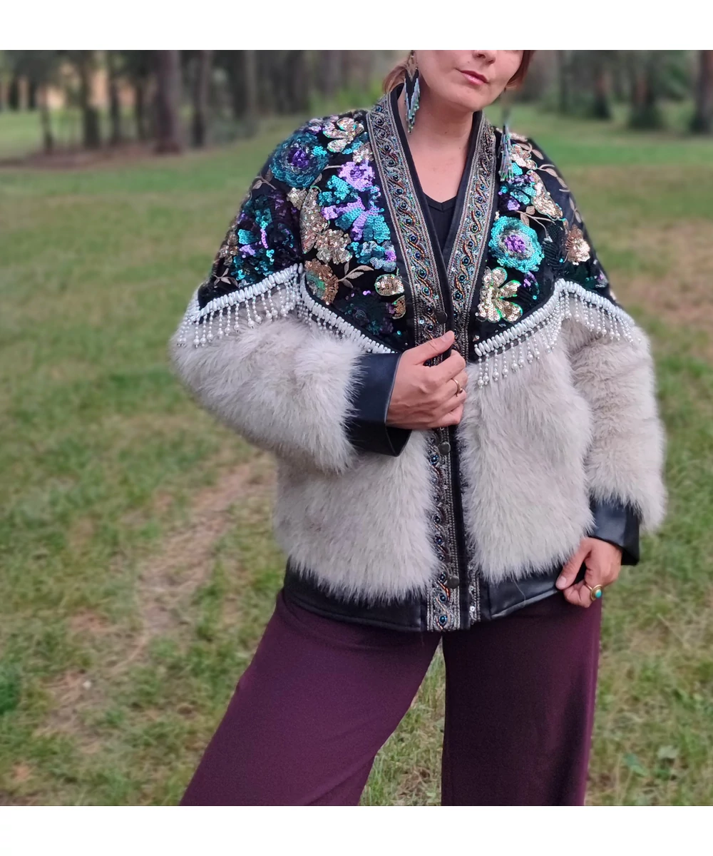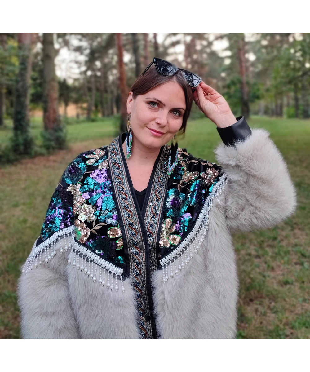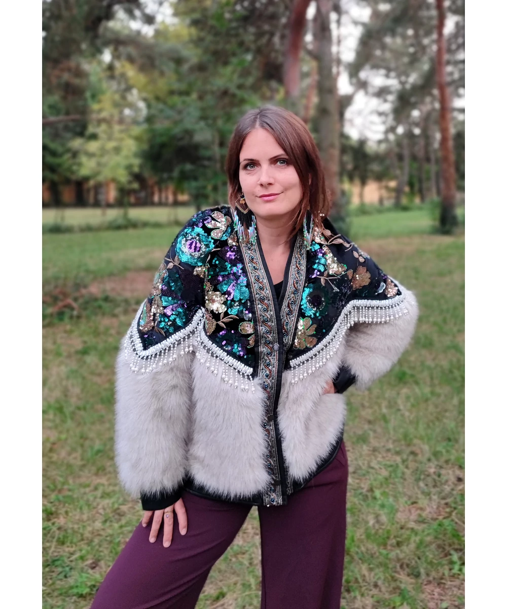 Egyedi és gyönyörű bohém, hippy, vintage stílusú téli kabát flitterekkel és gyöngyökkel díszítve. Igazi 60 -as 70 -es évek hangulat. Anyaga: felül tükörbársony amit flitteres virágminták díszítenek + gyöngyök + műszőrme + műbőr. Belül selyembéléses. Patenttal záródik. Minden alkalomra. :)