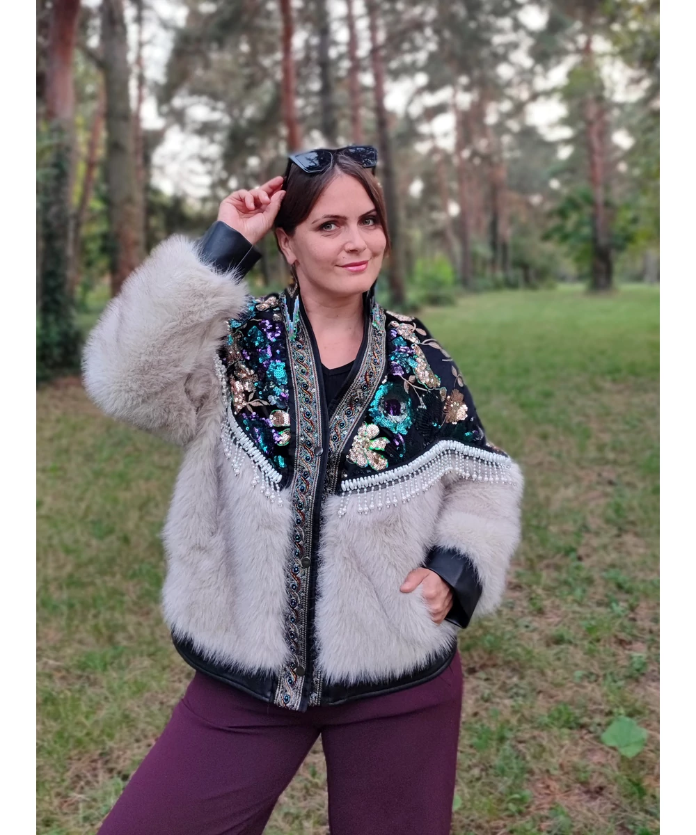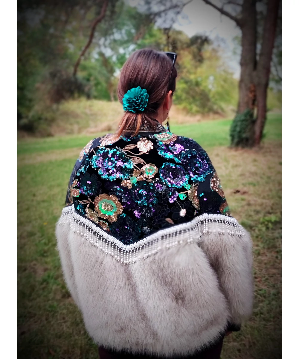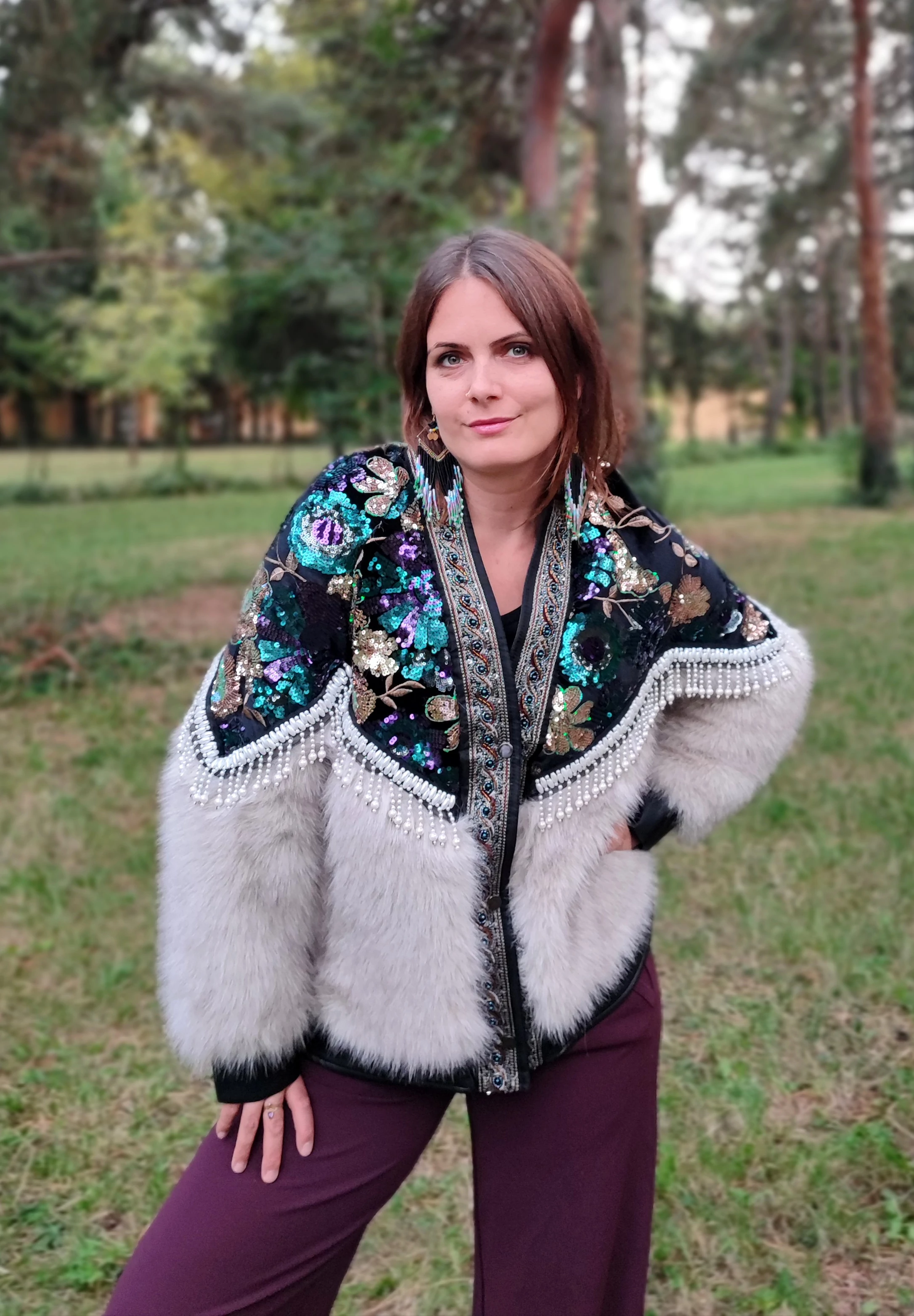 Egyedi és gyönyörű bohém, hippy, vintage stílusú téli kabát flitterekkel és gyöngyökkel díszítve. Igazi 60 -as 70 -es évek hangulat. Anyaga: felül tükörbársony amit flitteres virágminták díszítenek + gyöngyök + műszőrme + műbőr. Belül selyembéléses. Patenttal záródik. Minden alkalomra. :)