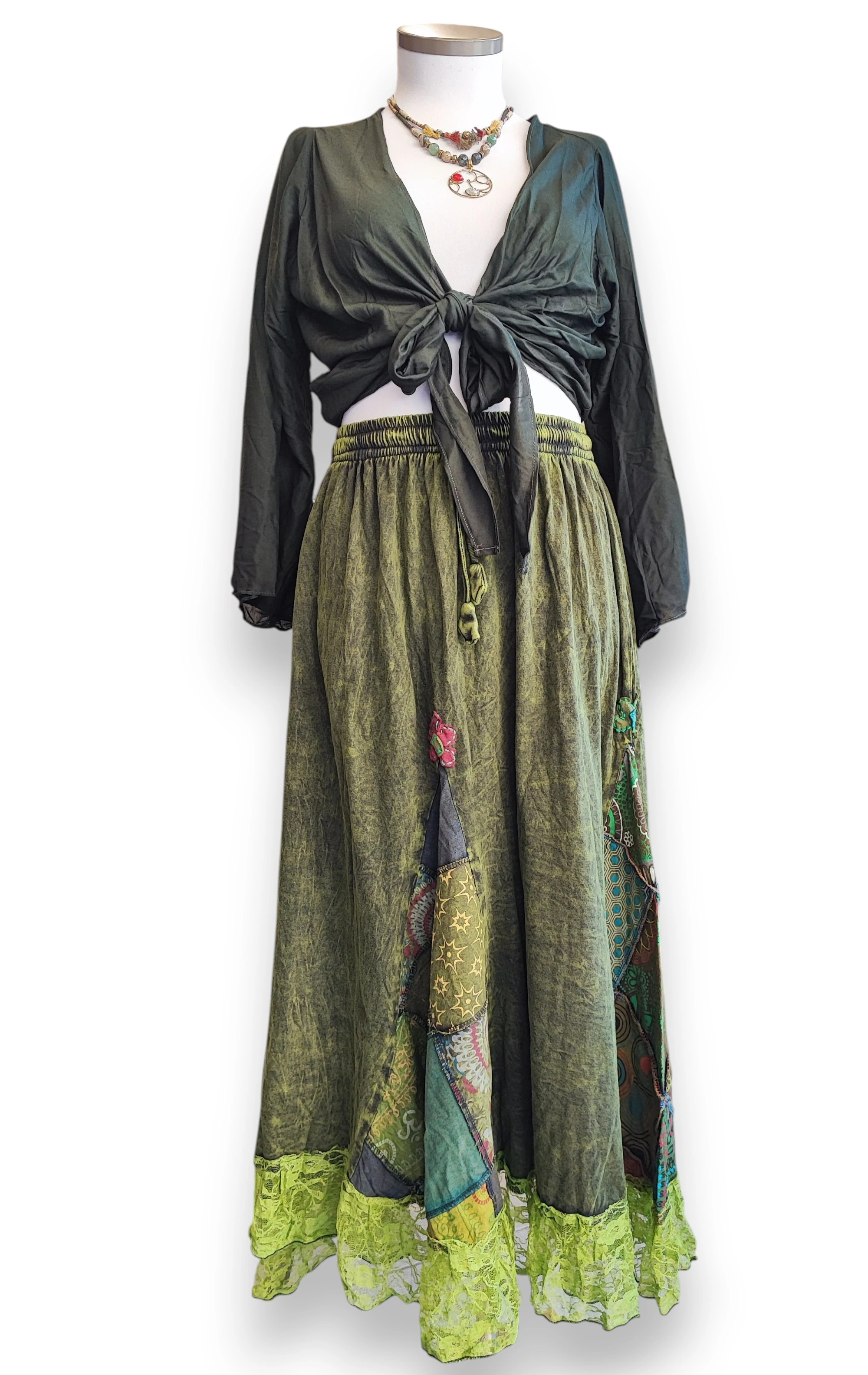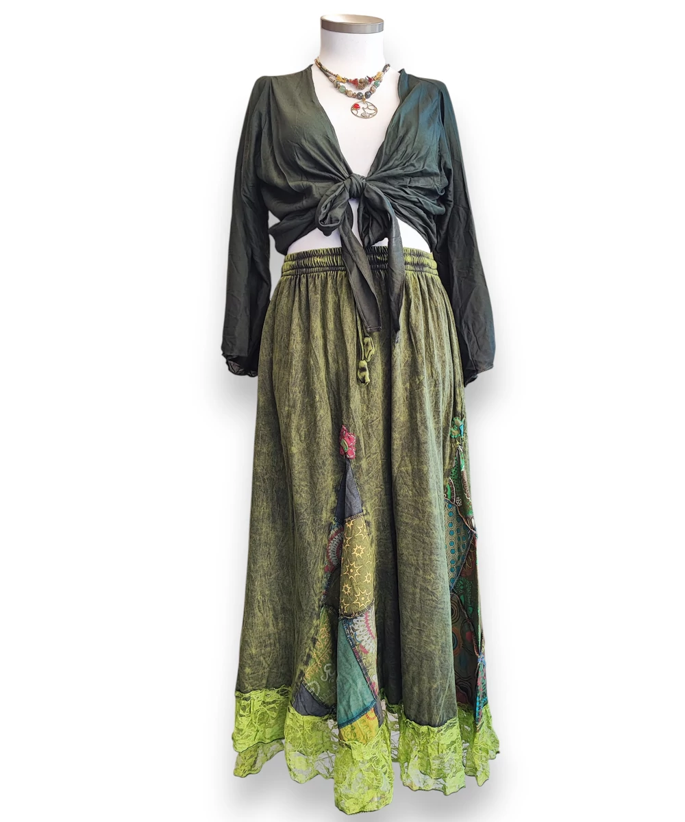 Fodros, csipkés nepáli maxi szoknya - hippy, zöld