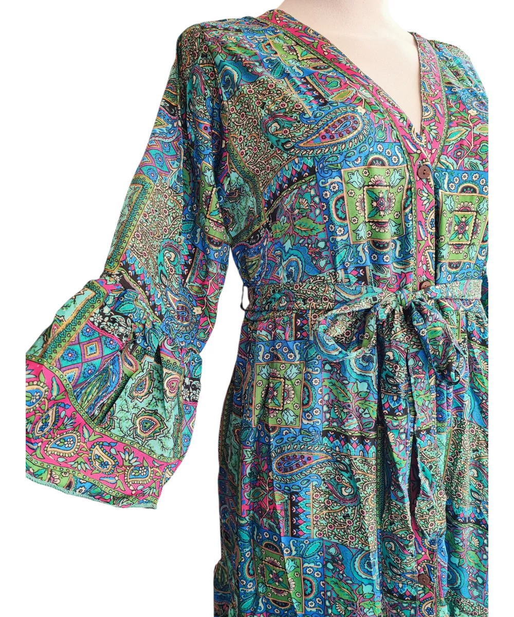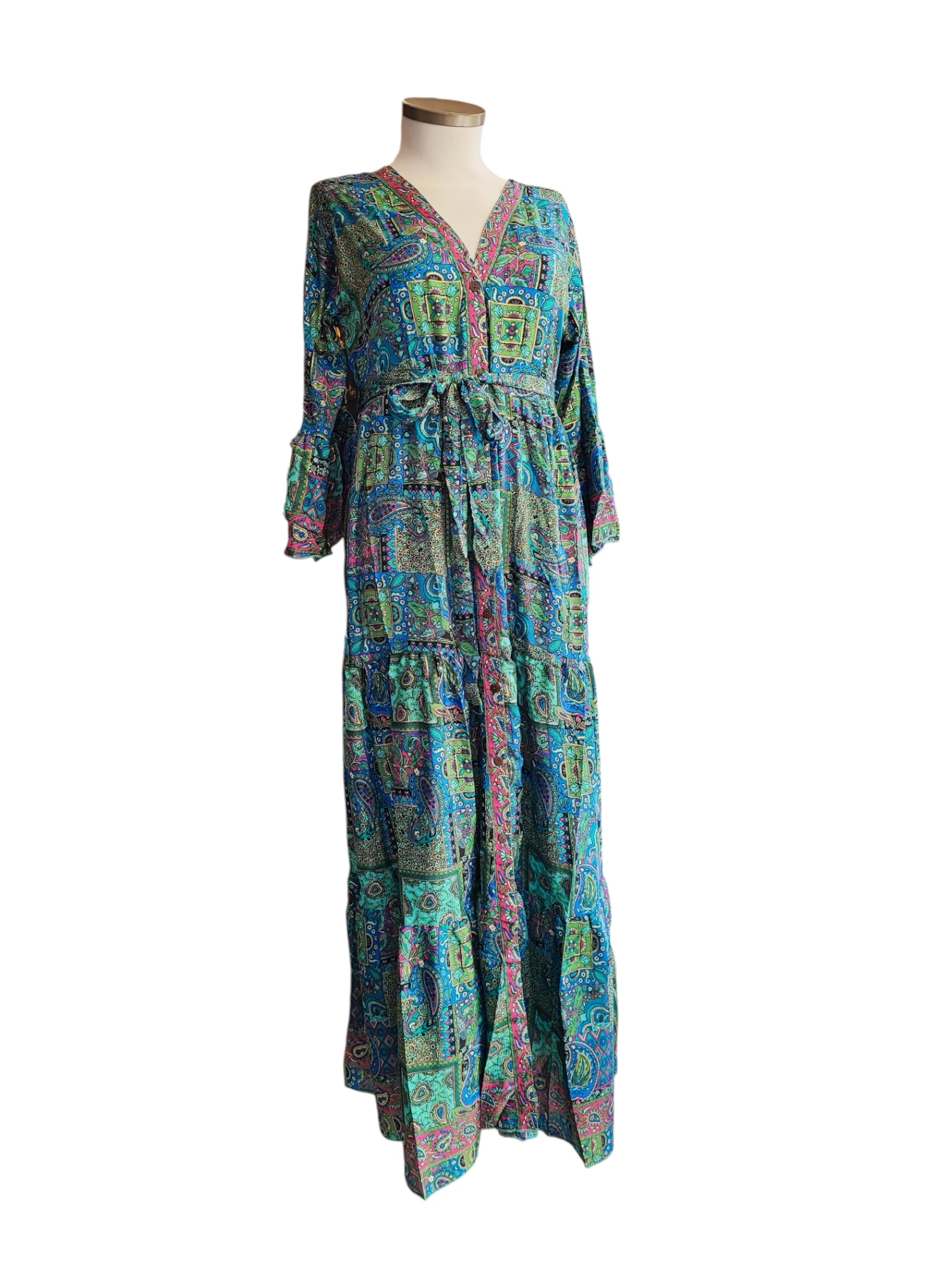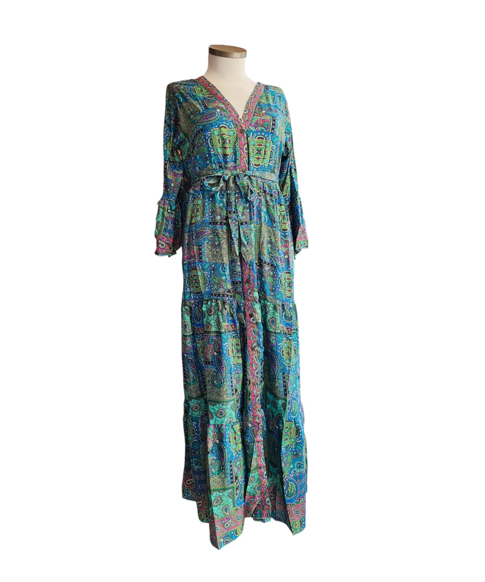 Maxi hosszúságú, végig gombos, fodros szoknyás ingruha.