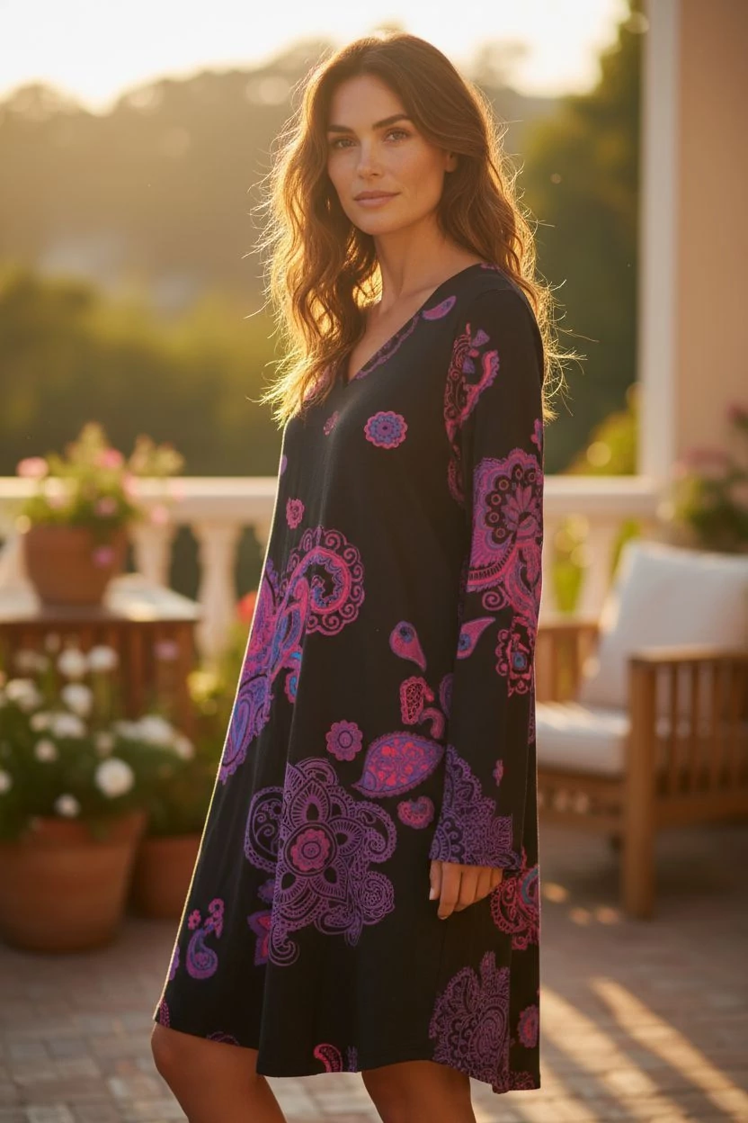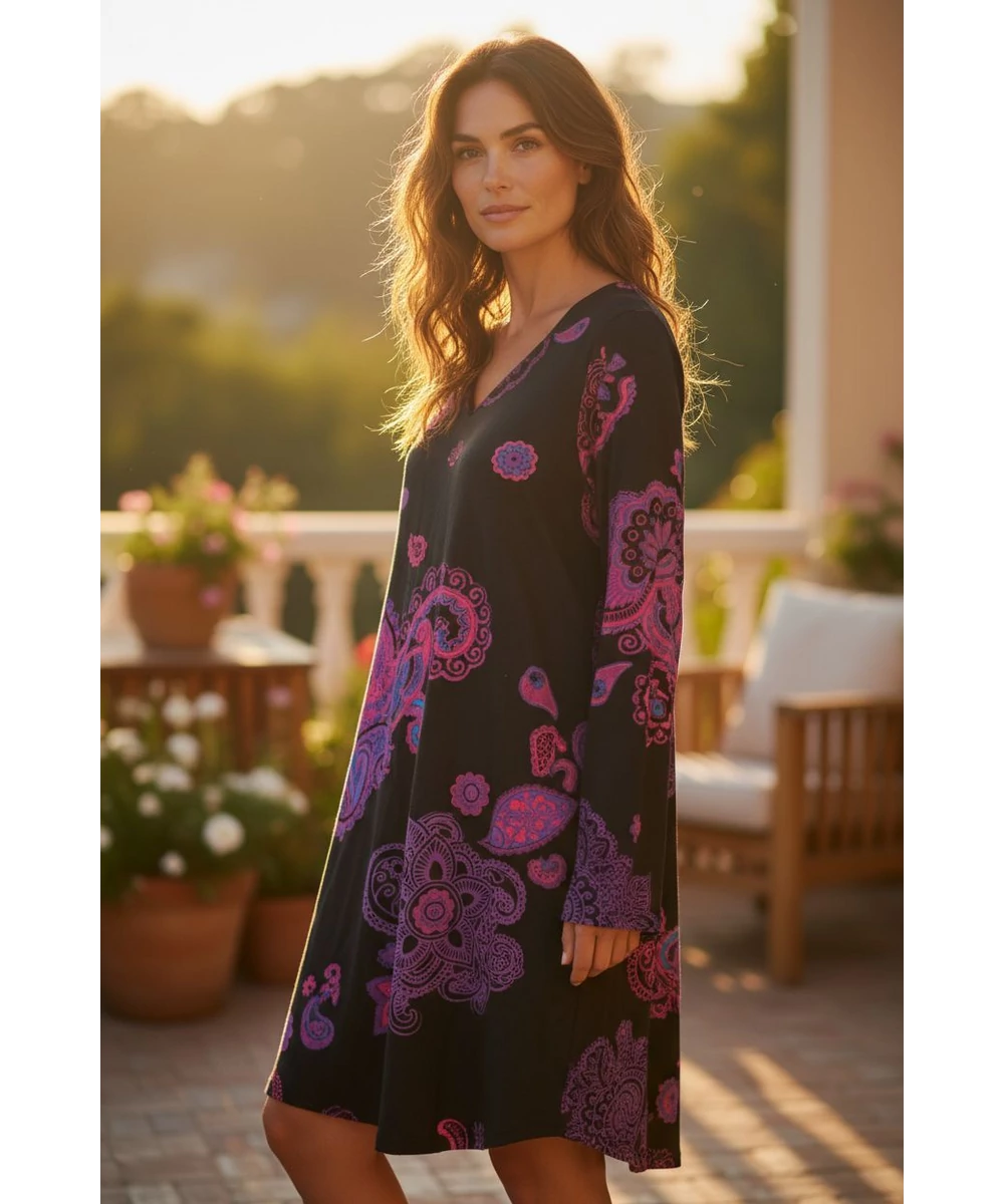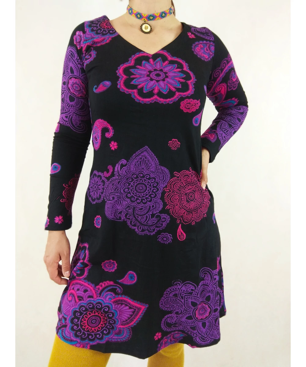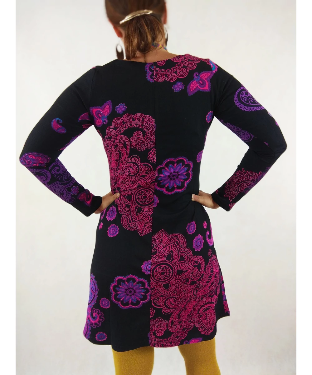 Karcsúsított fazonú, "A" vonalban bővülő, "V" - nyakú mini ruha. Vidám indiai henna mintákkal tarkítva.