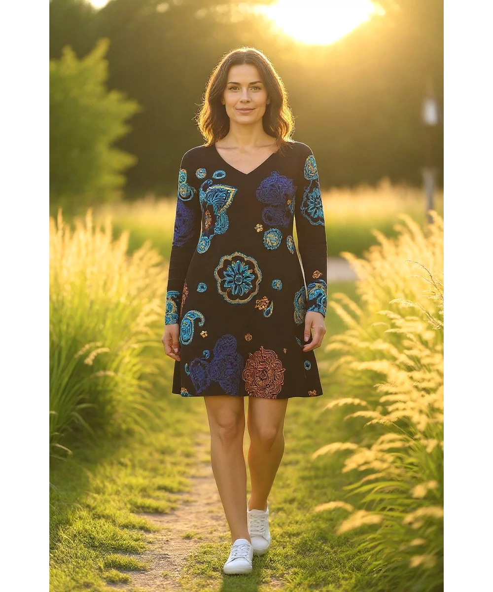 Karcsúsított fazonú, "A" vonalban bővülő, "V" - nyakú mini ruha. Vidám indiai henna mintákkal tarkítva.