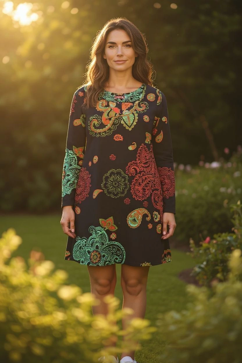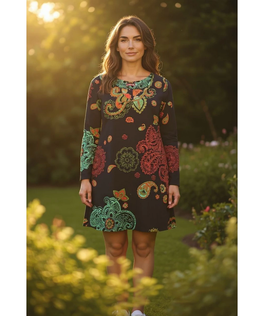 Karcsúsított fazonú, "A" vonalban bővülő, "V" - nyakú mini ruha. Vidám indiai henna mintákkal tarkítva.