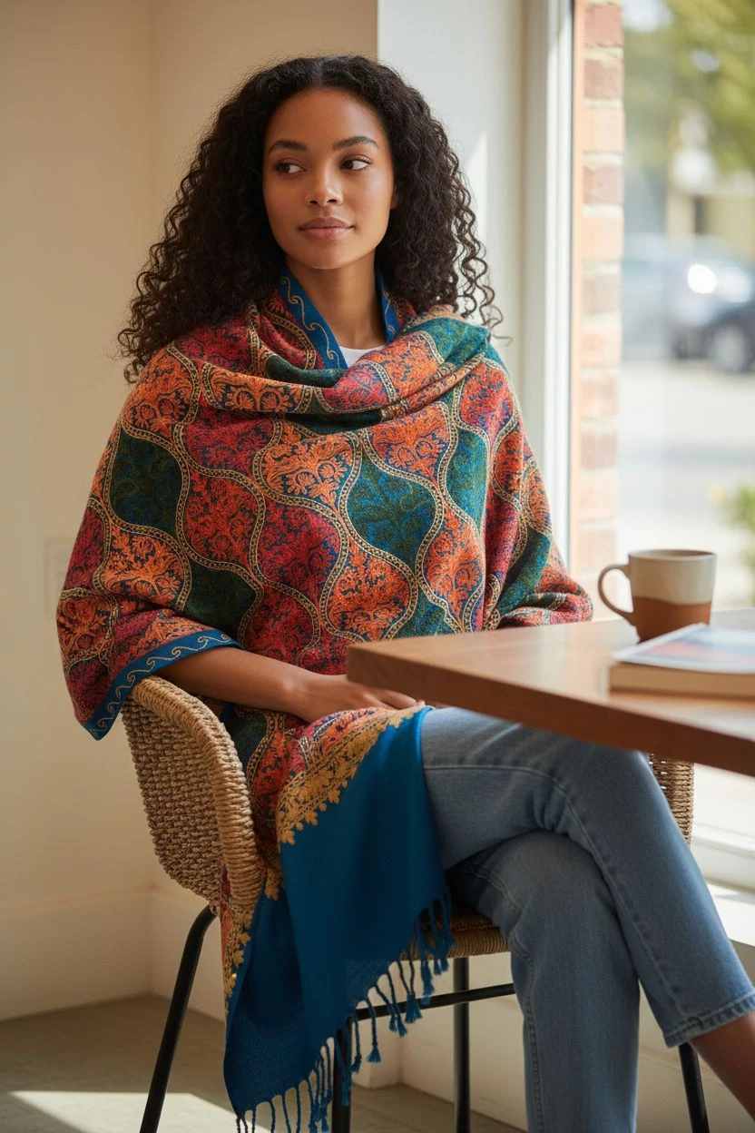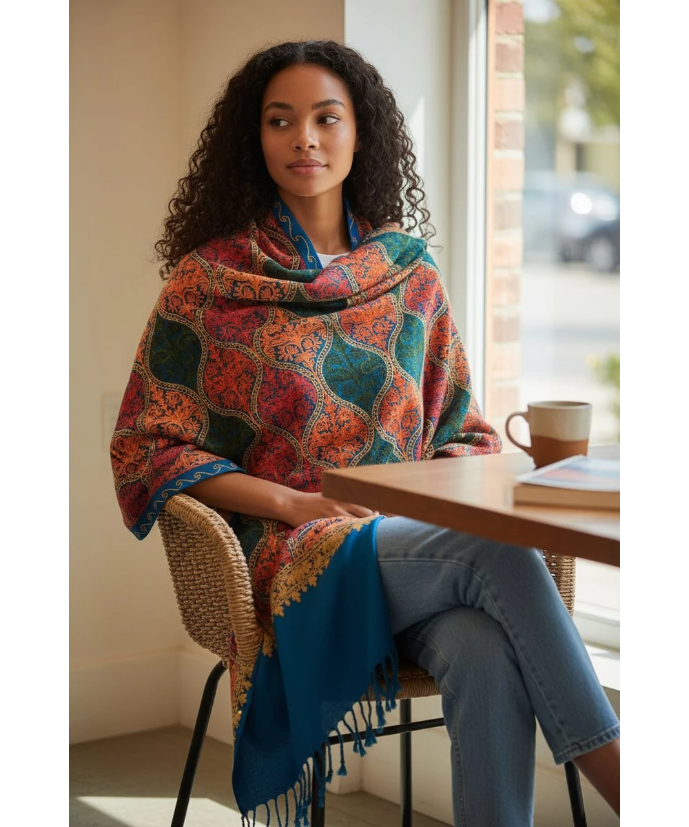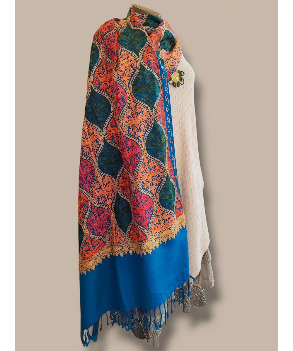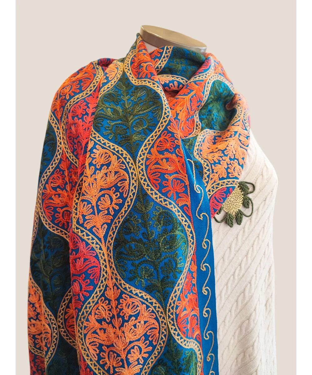 Gazdagon hímzett indiai stóla ornamentikus mintával. Anyaga viszkóz és gyapjú keverék.