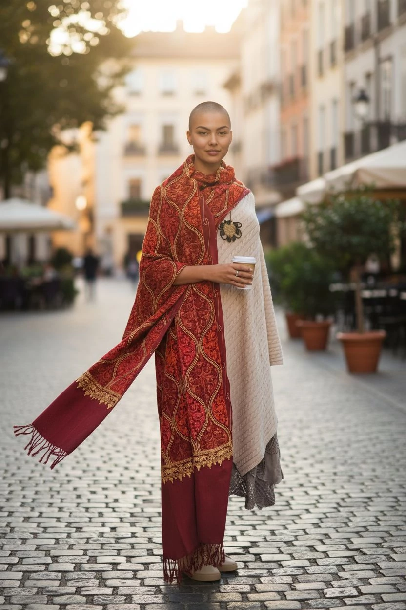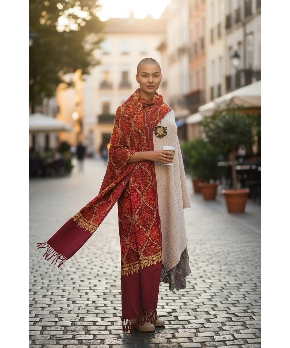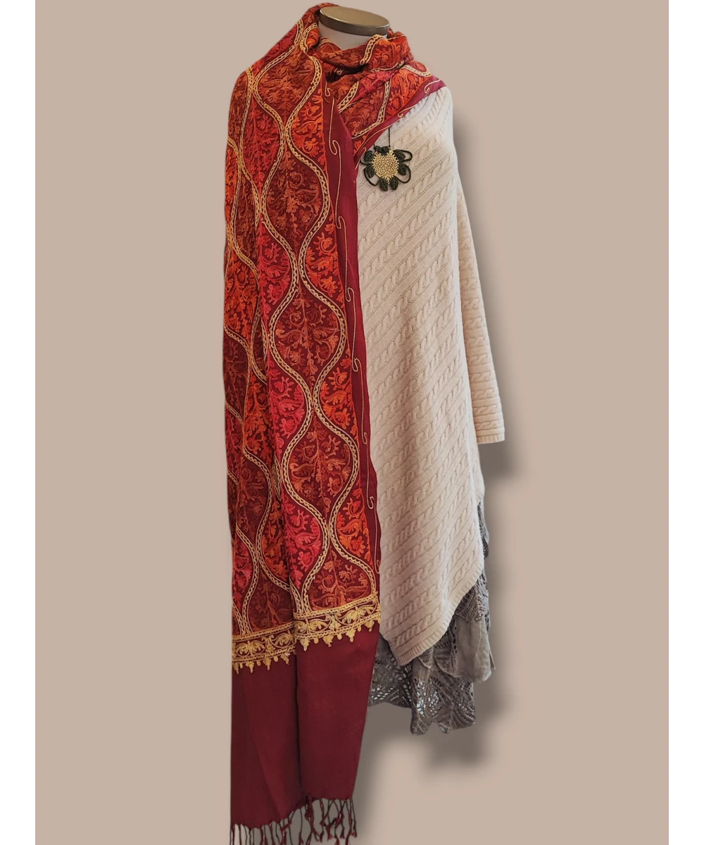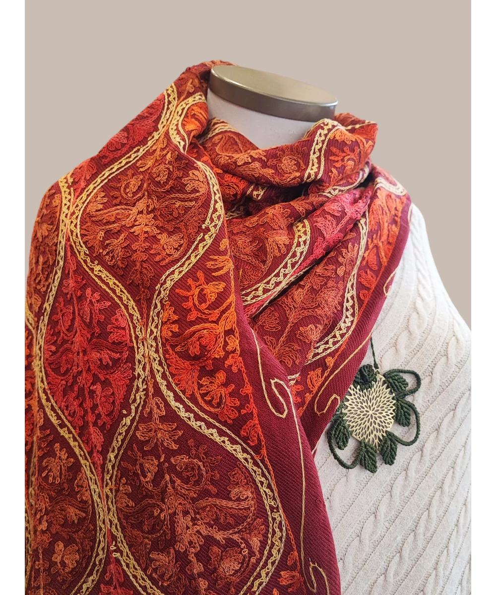 Gazdagon hímzett indiai stóla ornamentikus mintával. Anyaga viszkóz és gyapjú keverék.