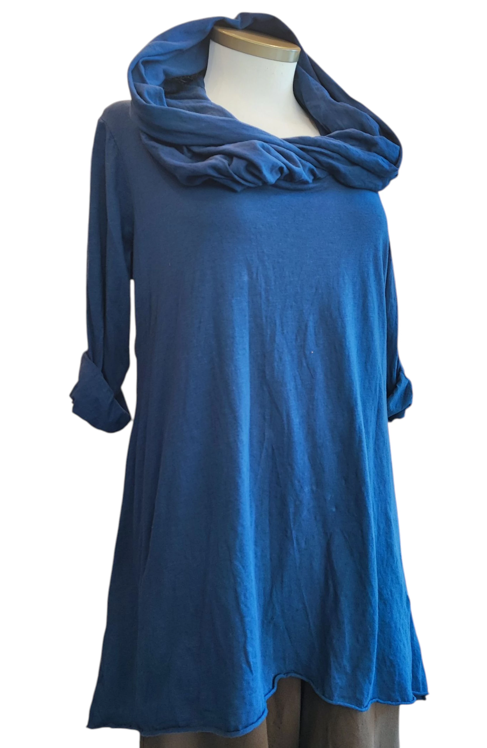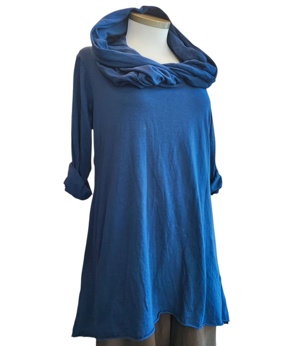 Lezser pamut felső, hosszított fazonnal és kámzsás nyakkal.