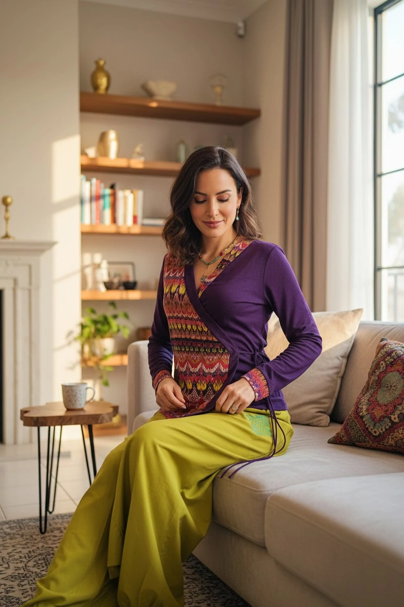 Az átlapolós fazon nőies megjelenést kölcsönöz, a lila szín pedig különlegessé és stílusossá teszi a kardigánt. Tökéletes választás hétköznapi vagy fesztiválos öltözékekhez egyaránt.