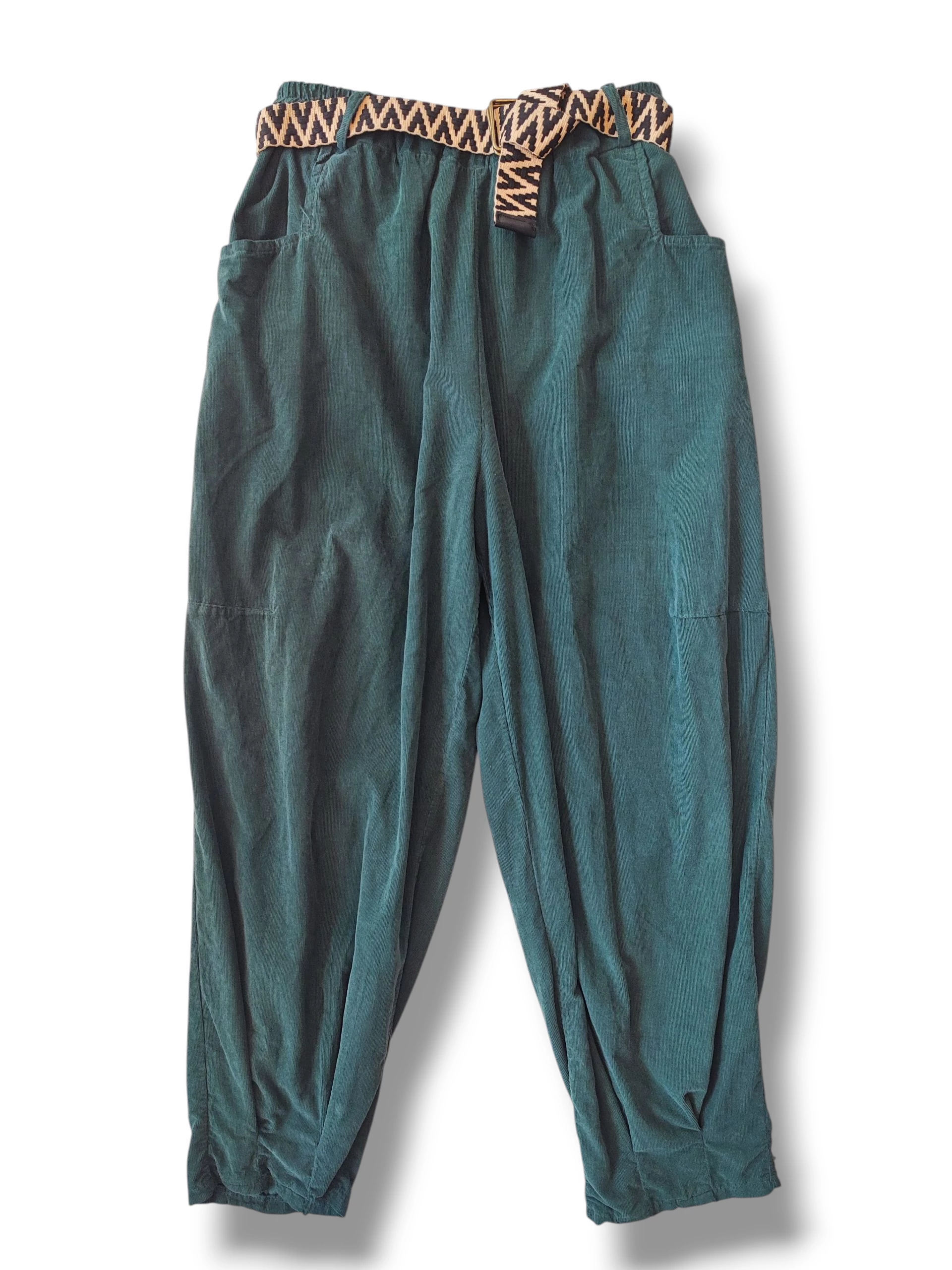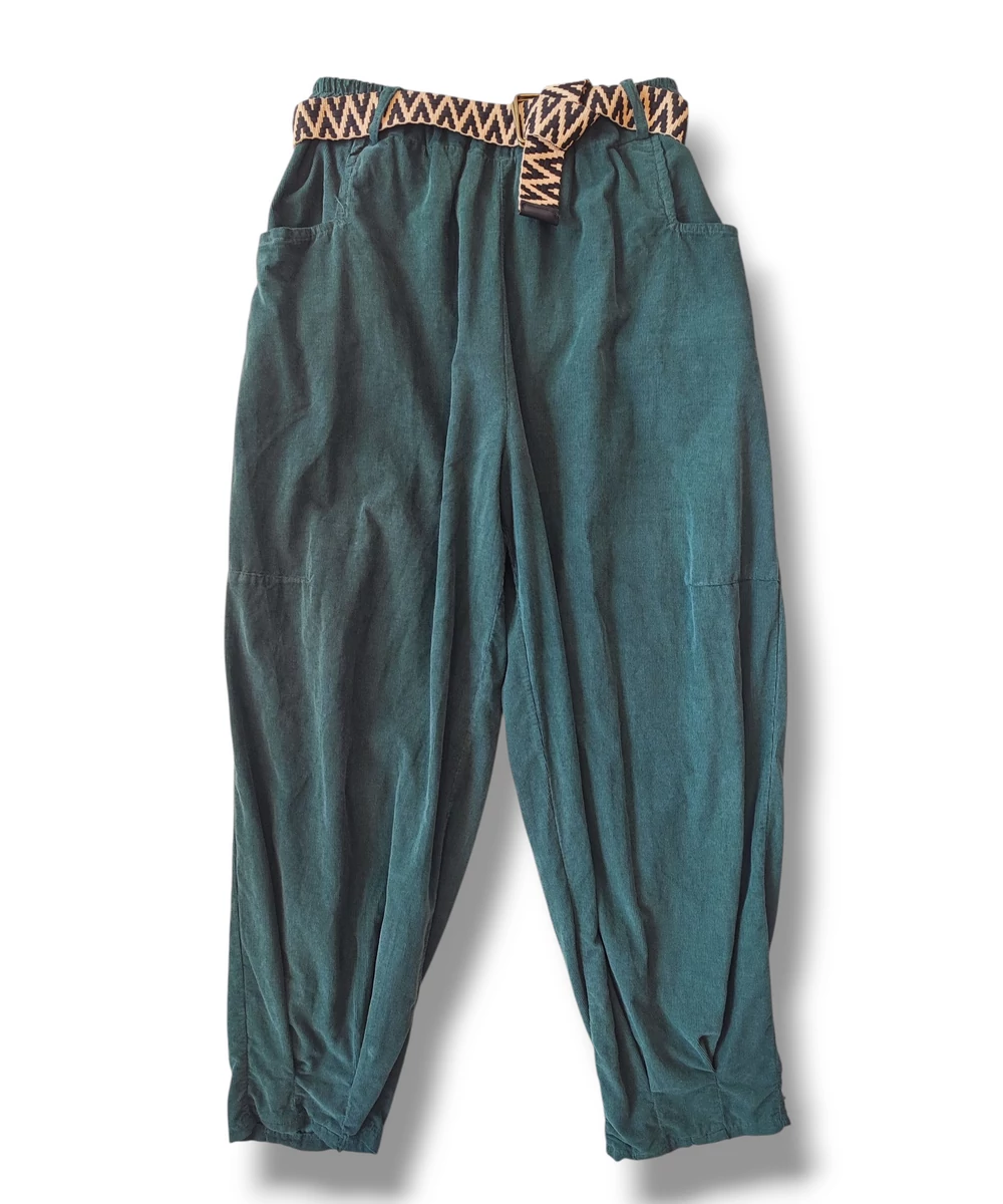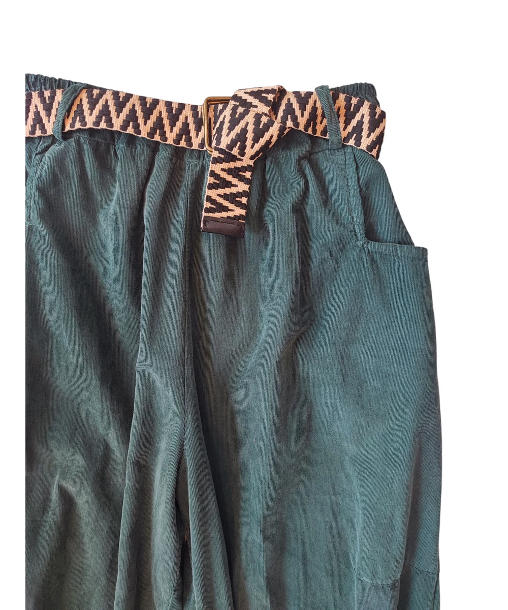 Méret nélküli mikrokord nadrág, gumis derékkal, oldalán zsebbel, bohém övvel.