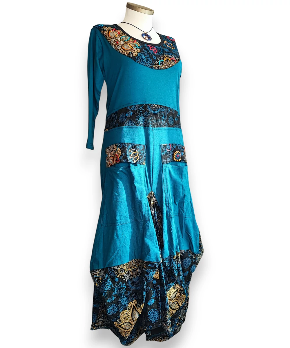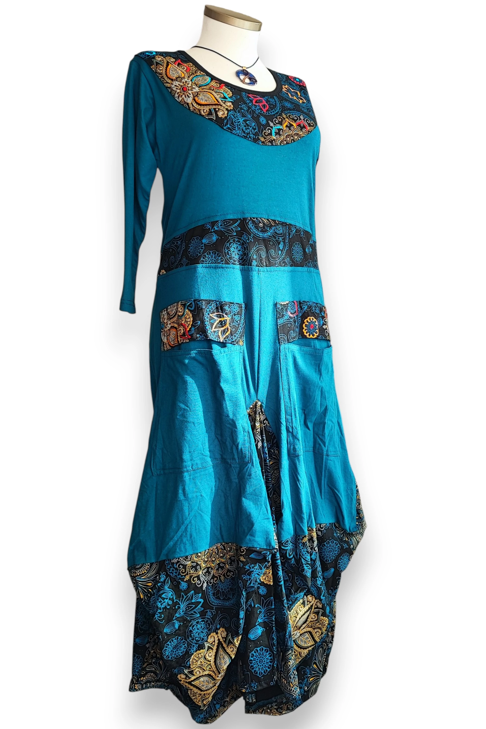 Vagány nepáli maxiruha, karcsúsított fazon elöl két zseb, buggyos alj. Anyag: 100% pamut