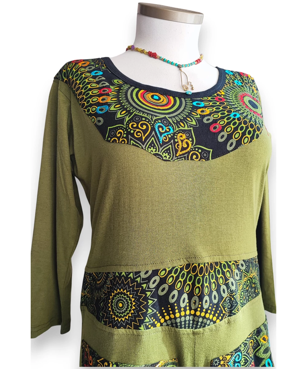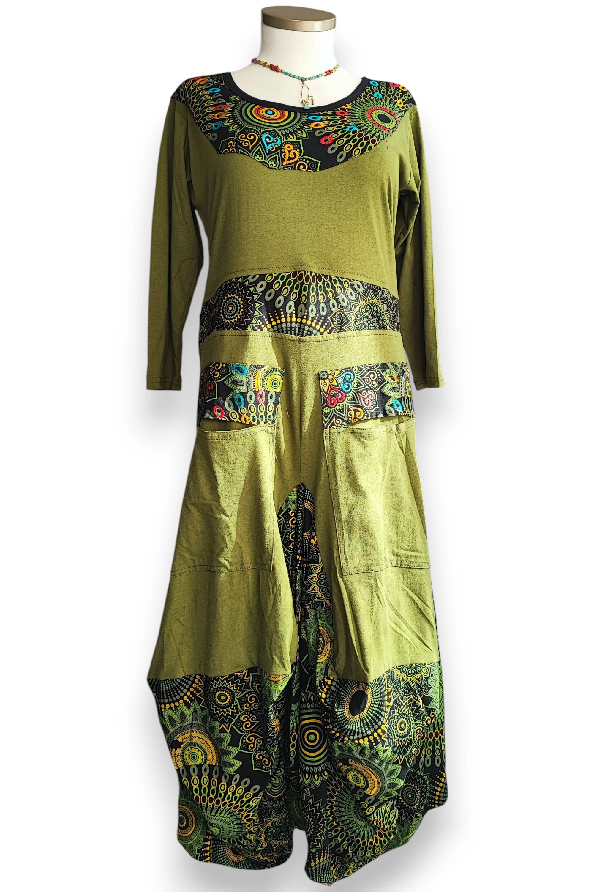 Vagány nepáli maxiruha, karcsúsított fazon elöl két zseb, buggyos alj. Anyag: 100% pamut
