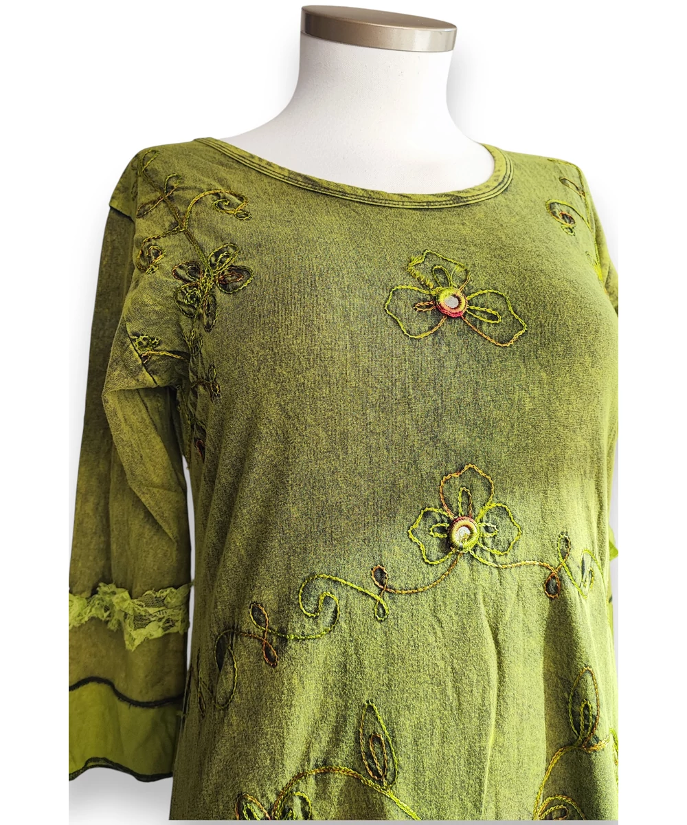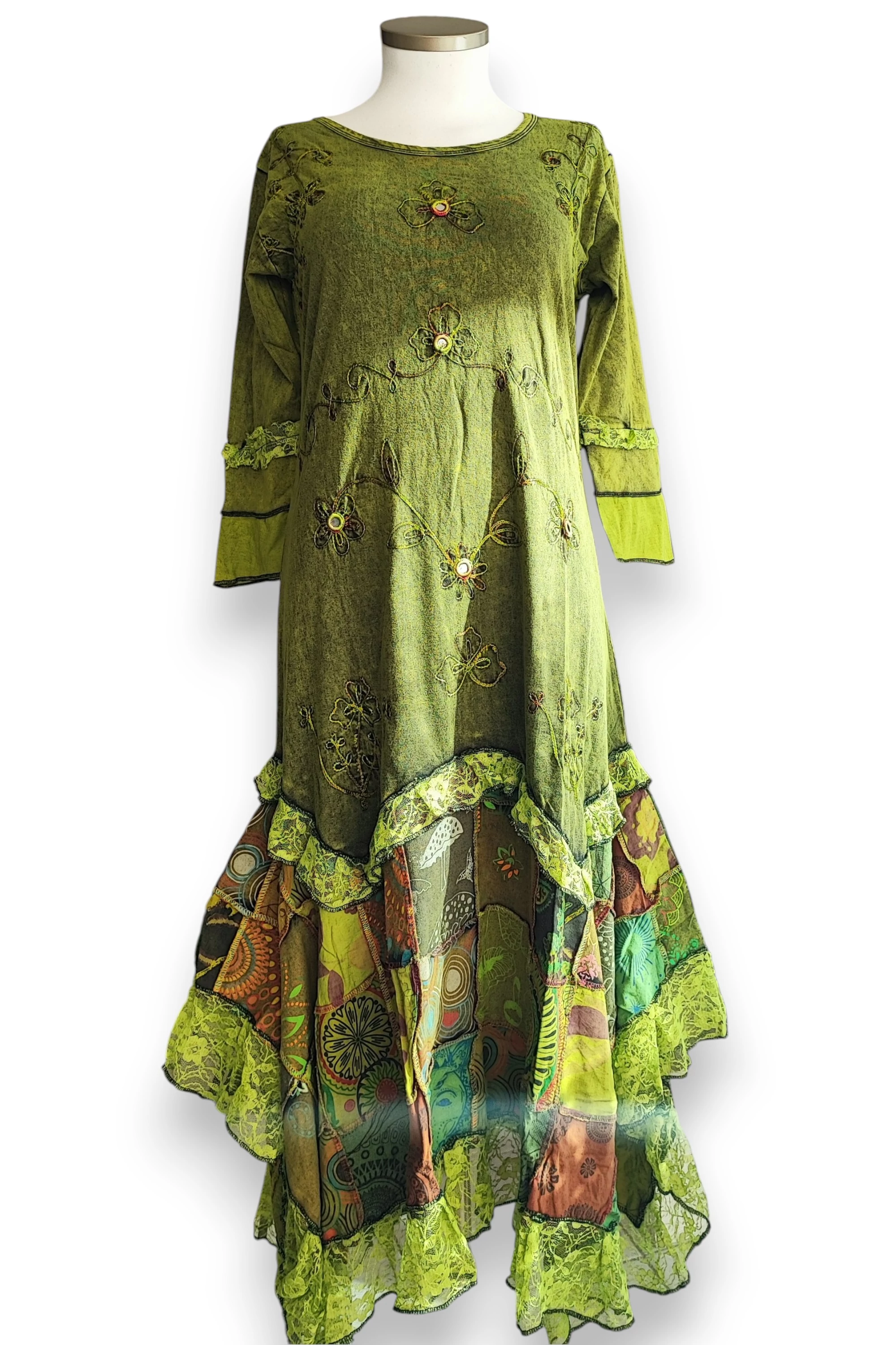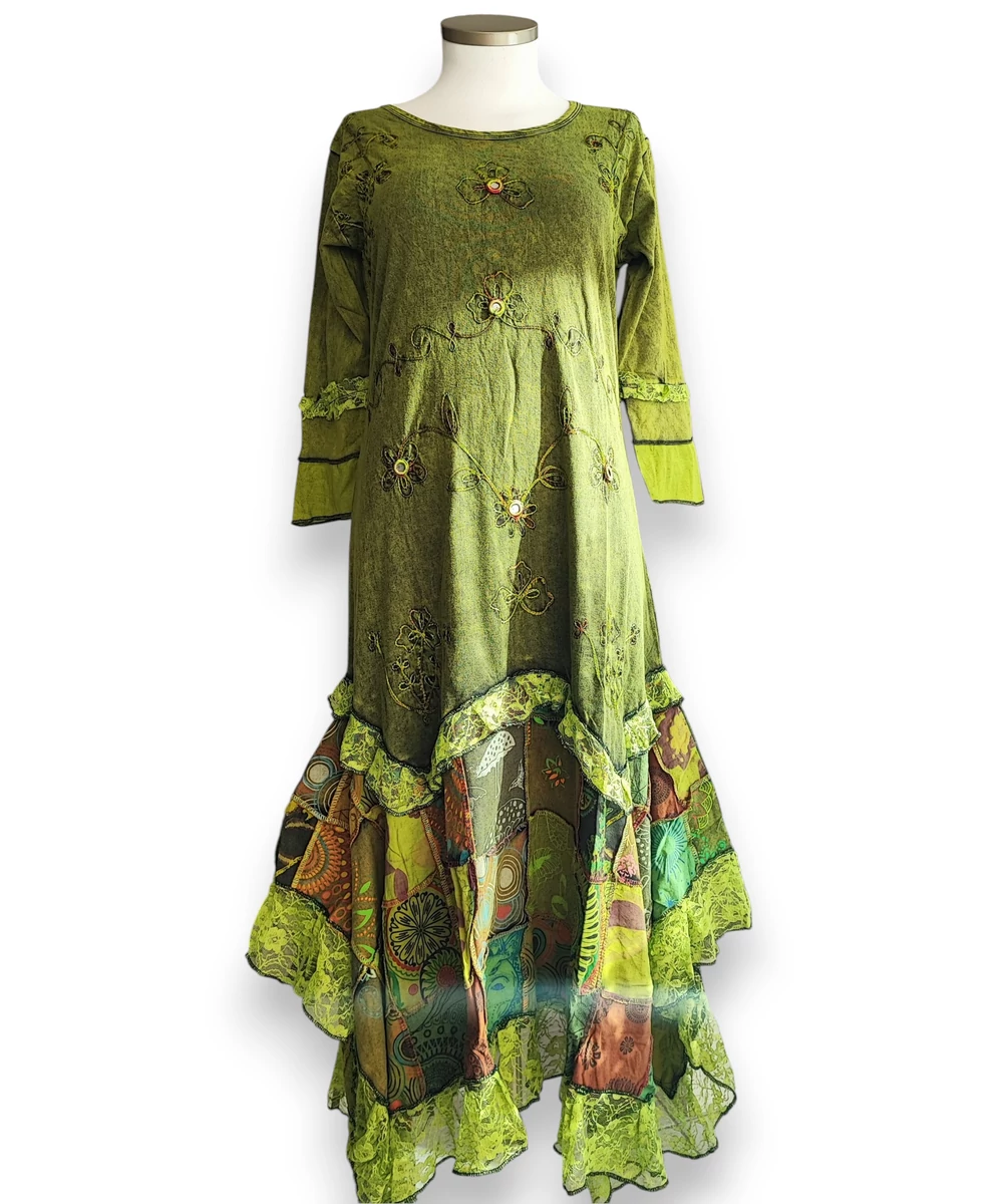 Extravagáns, nepáli maxi ruha, csipke berakásokkal. A ruha szoknya része patchwork mintás, aszimmetrikus szabású. Anyaga 100% - ban pamut.