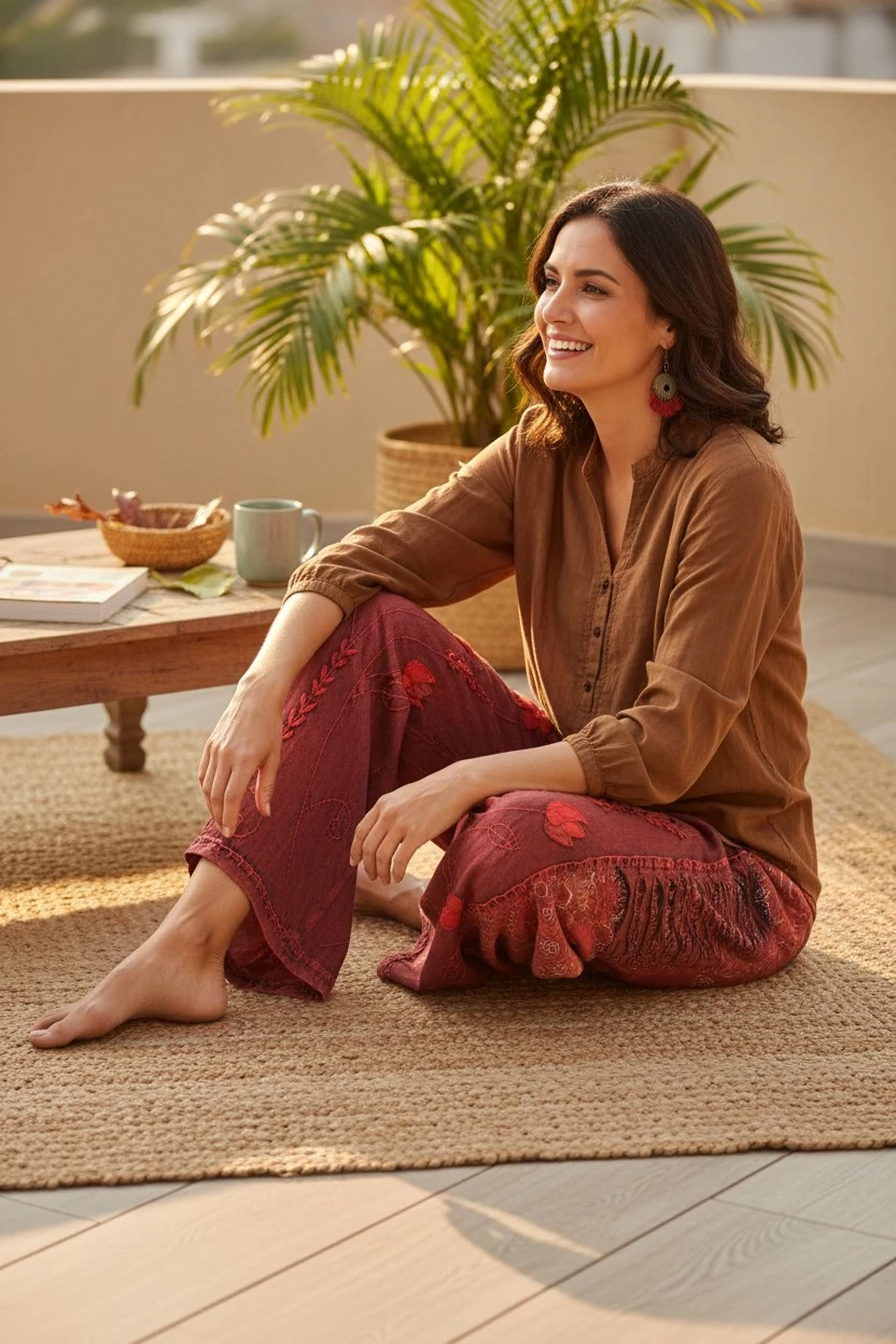 Nepáli pamut nadrág virág díszítéssel - bordó