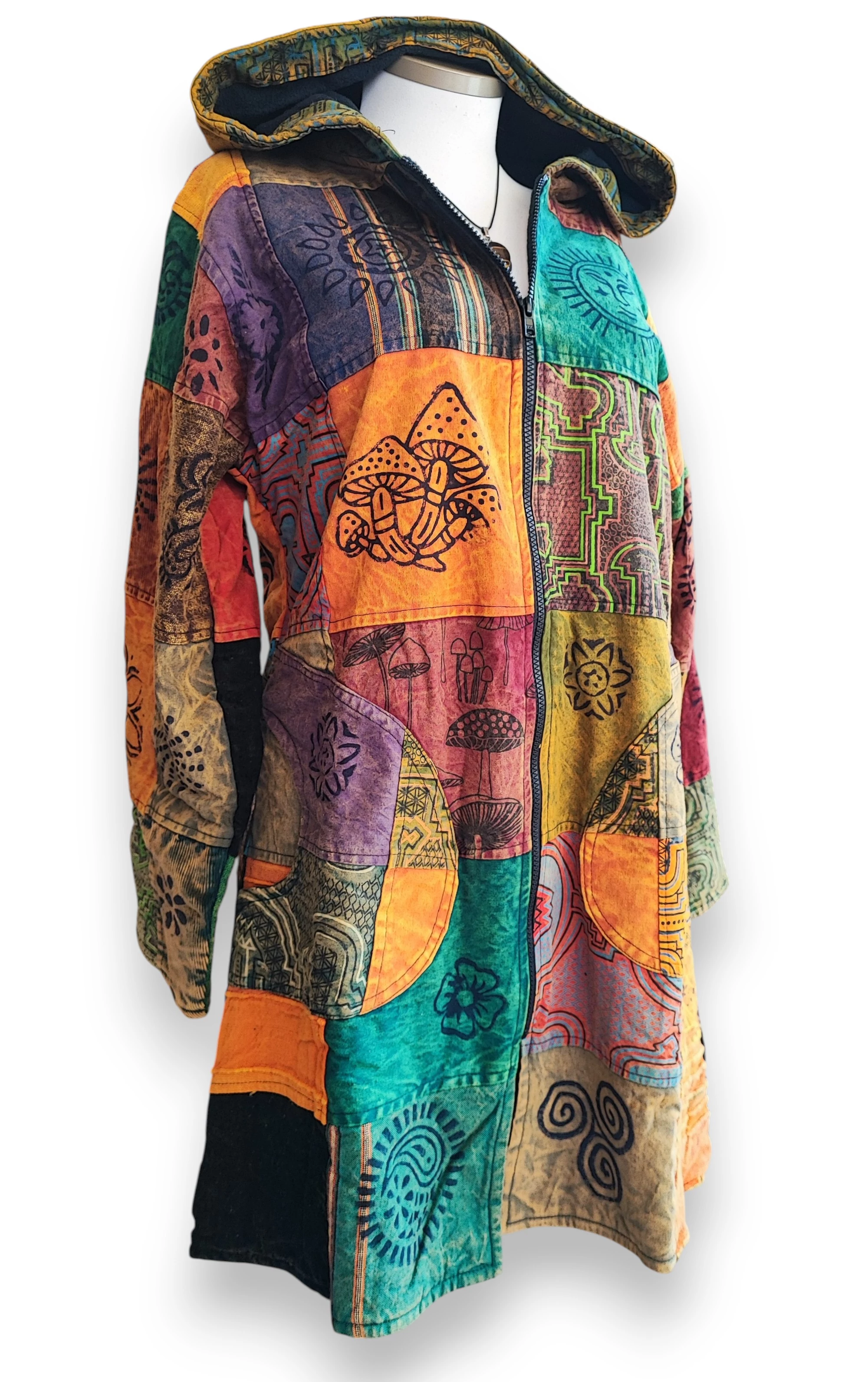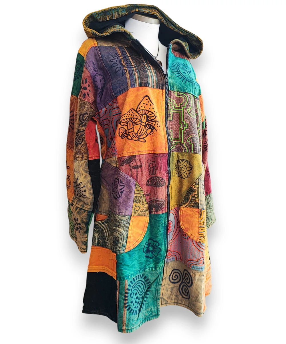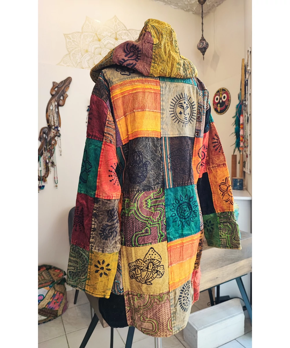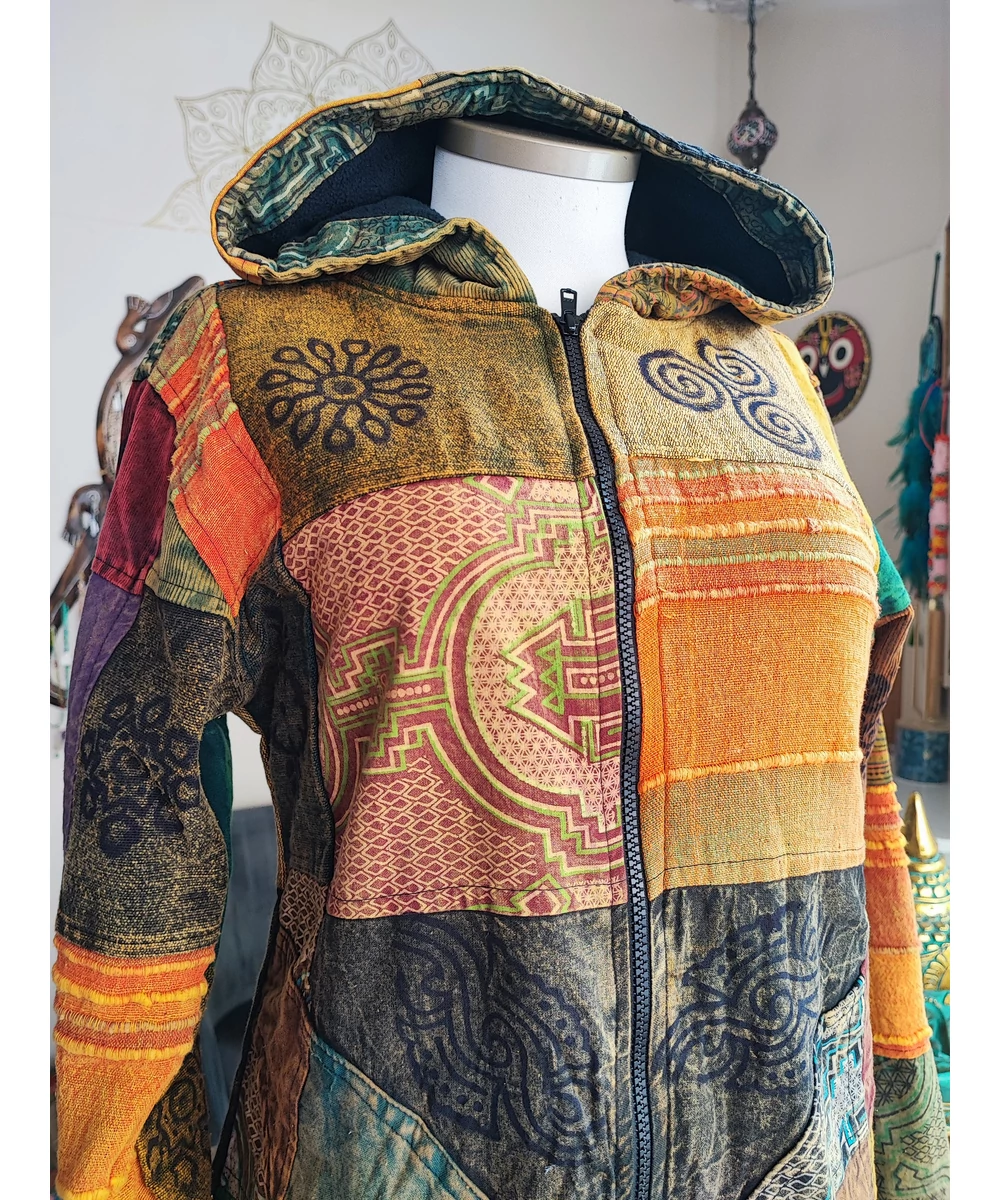 Kapucnis, patchwork mintájú nepáli kabát. Karcsúsított fazon, zsebes, cipzáras.