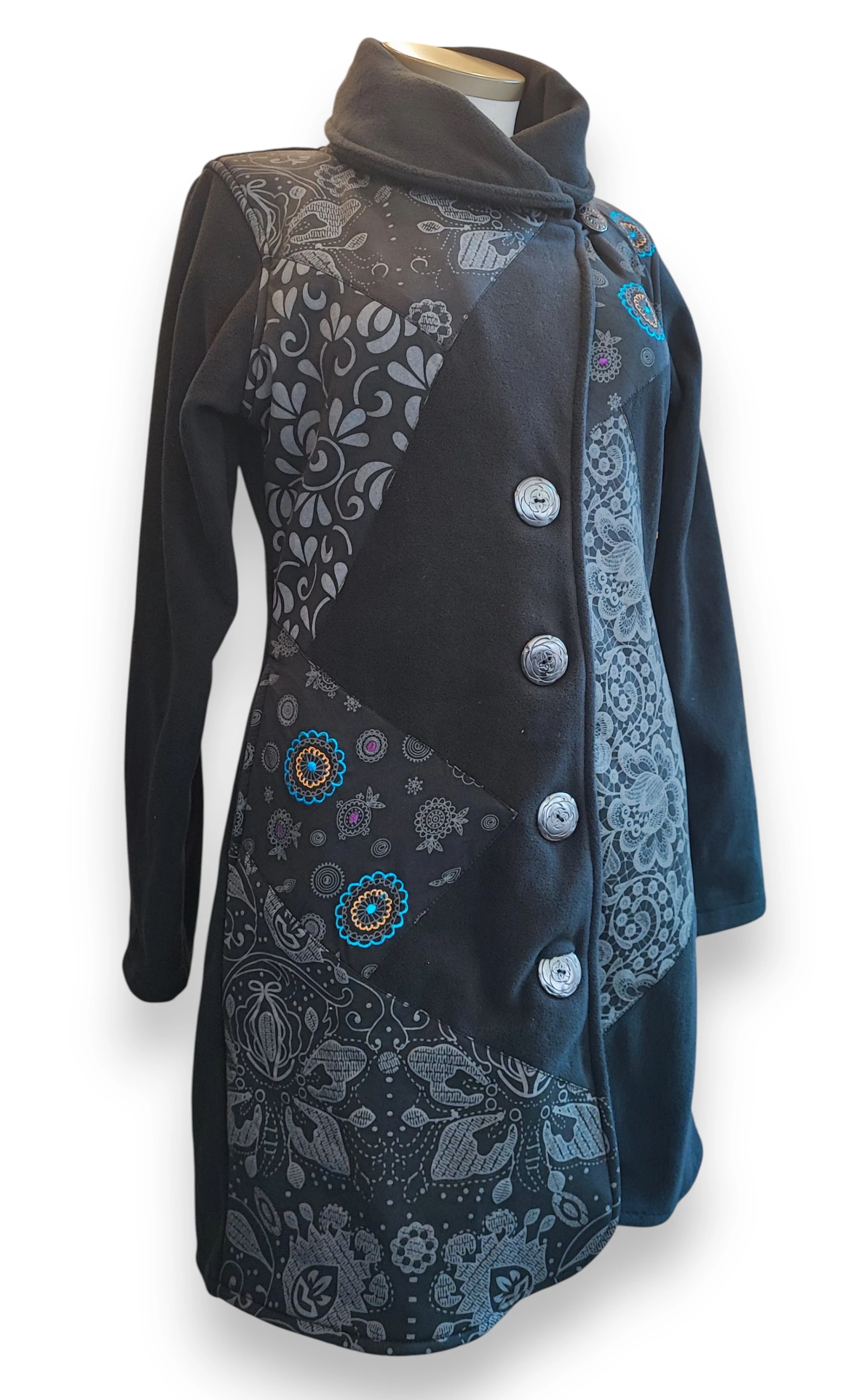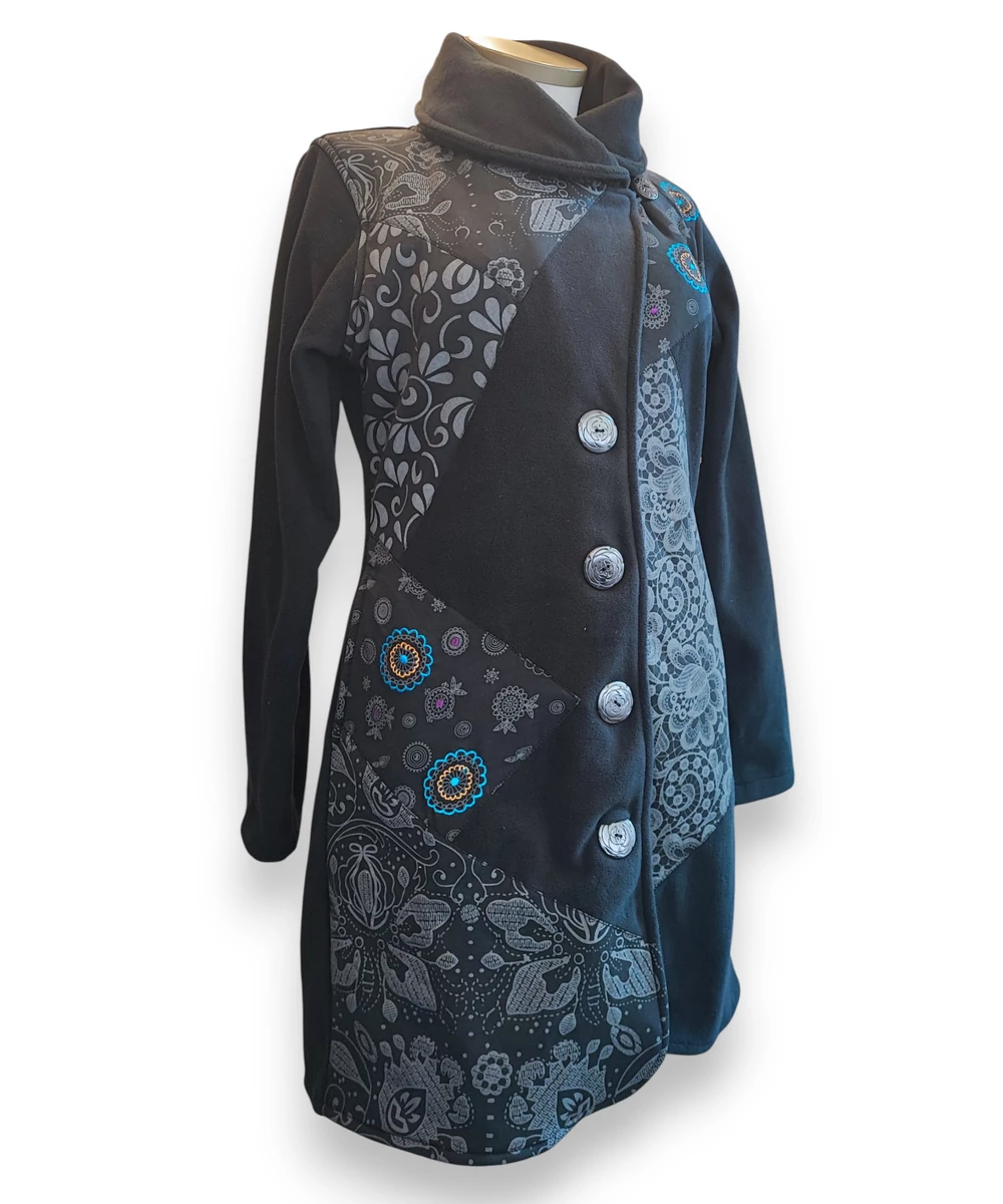 Egyedi szabású, vastag polár kabát Nepálból. Elegáns és egyben kényelmes viselet. Karcsúsított fazon.